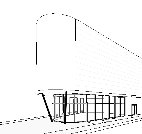render building 3 stories with modern glass wall and slander columns round corner to be higher than rest of the building