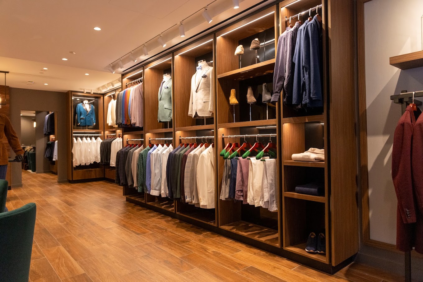 in the reference image within a product display add a black metal tube display with rounded corners displaying a suit jacket