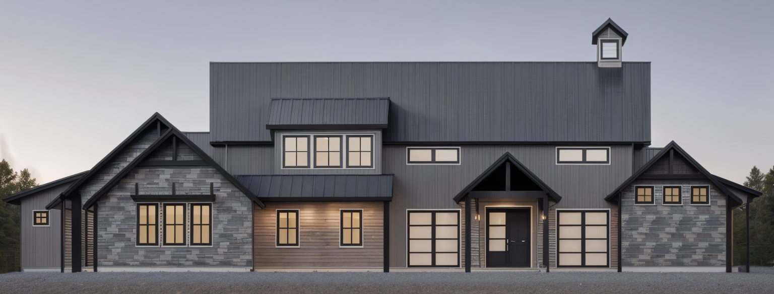 modernist exterior shot modern farmhouse with black steel roof dark gray siding gray and white stone and brown wood accents architecture