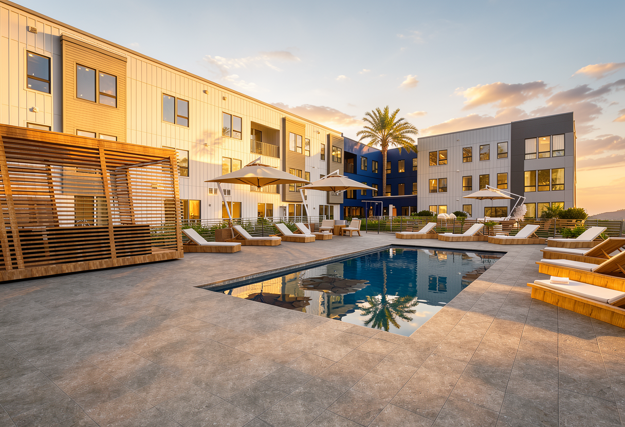 photo of a modern commercial building featuring dynamic wave like fa ade elements constructed with sleek white concrete and expansive glass panels surrounded by landscaped greenery including planters with trees at street level shot during golden hour casting soft shadows that emphasize texture and detail captured from a slightly elevated angle with a 35mm lens allowing a wide perspective to include the surrounding urban environment and distant structures enhancing the visual impact and context of the architecture