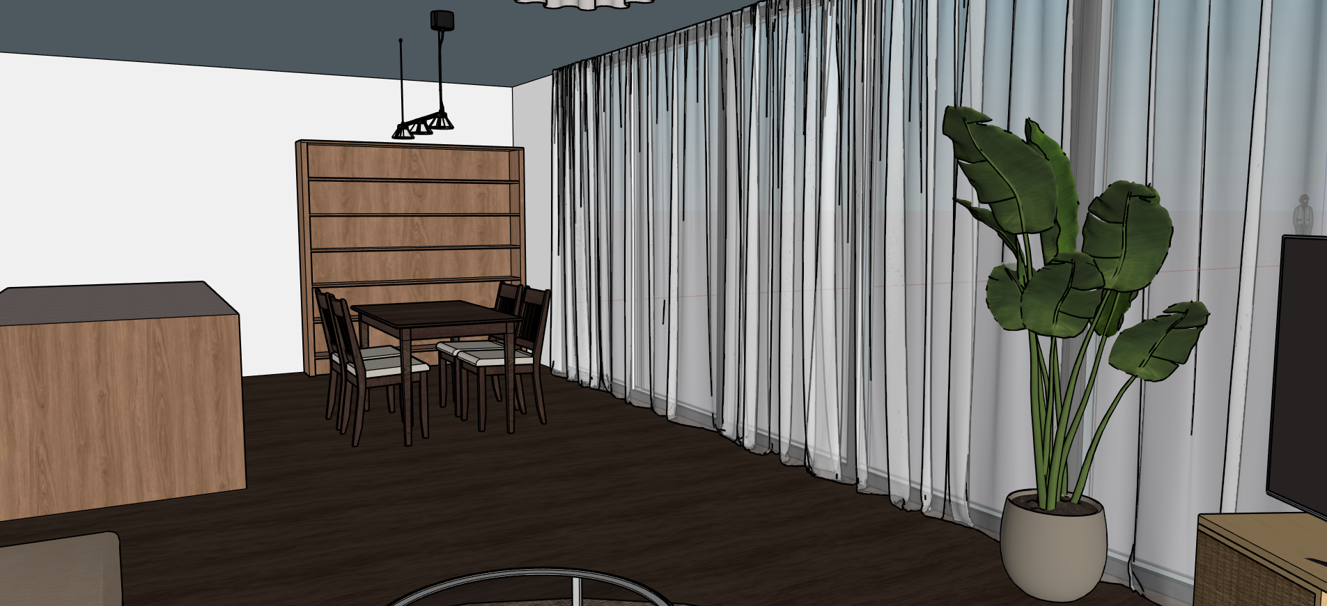 make this sketchup screenshot look like a realistic photo with photorealistic textures and nice moody lighting and natural light from behind the transparent curtains