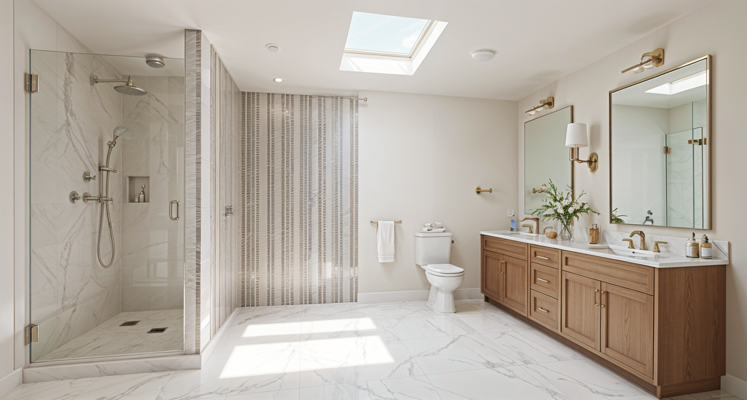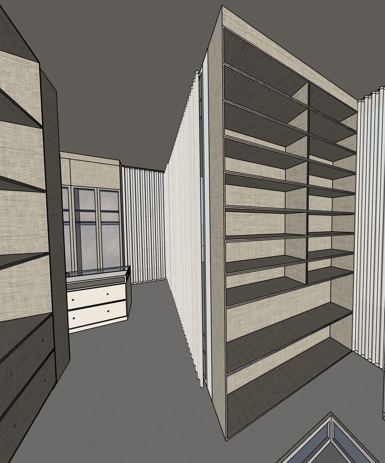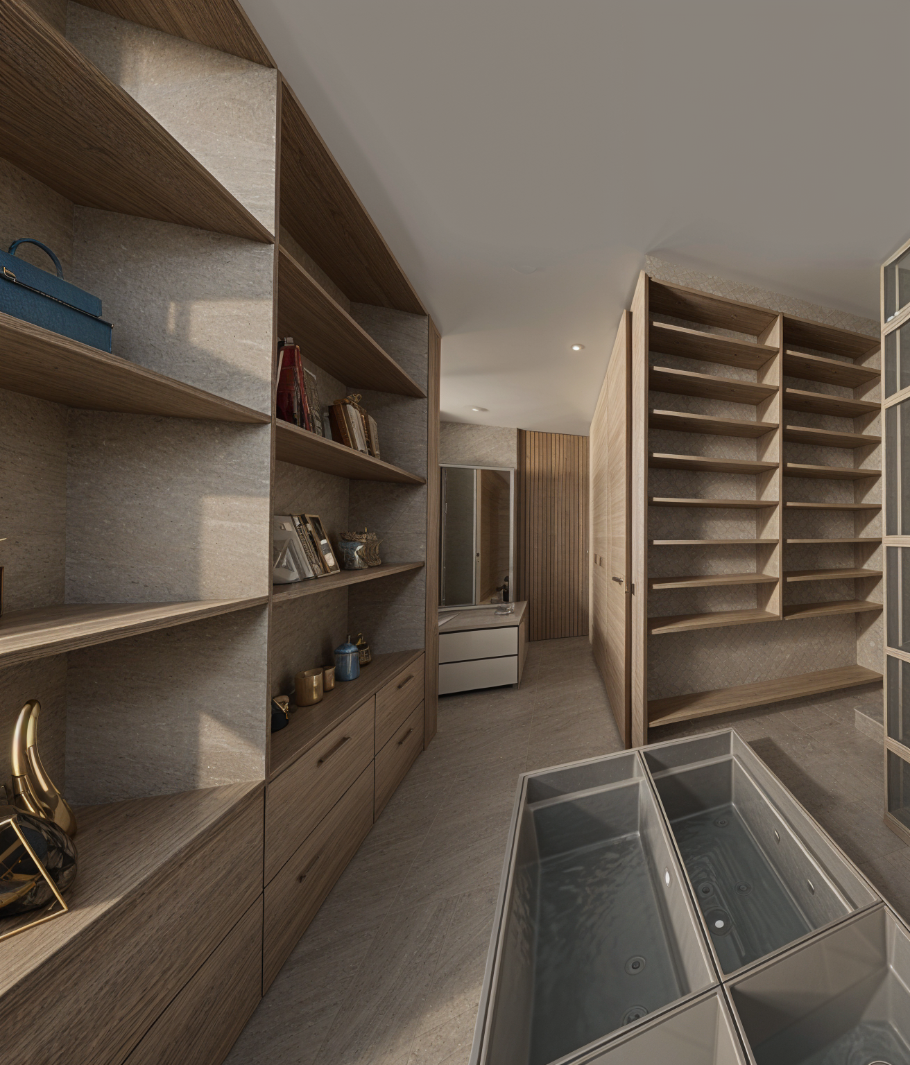 render a luxurious woman s walk in closet featuring sleek modern cabinetry with a light beige linen texture finish incorporate glass doors with subtle reflections creating a sense of openness use sheer curtains and ambient lighting to evoke a cozy and inviting atmosphere the floor should be a smooth matte ivory tile add brass handles for a touch of sophistication the overall vibe should be elegant and serene with a focus on luxury and organization a beautiful display of purses