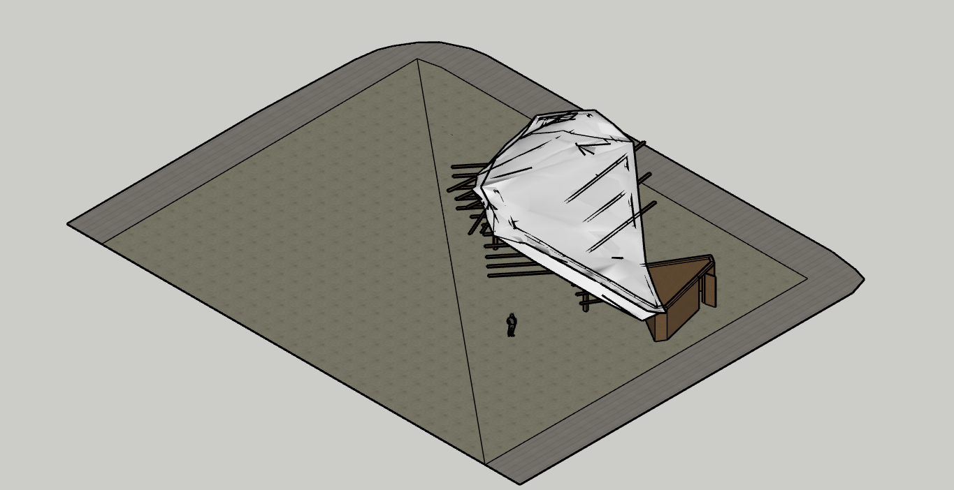 architecture model studio lighting tiled stone ground concrete pavement wide shot whole model black studio warm light linen overhang