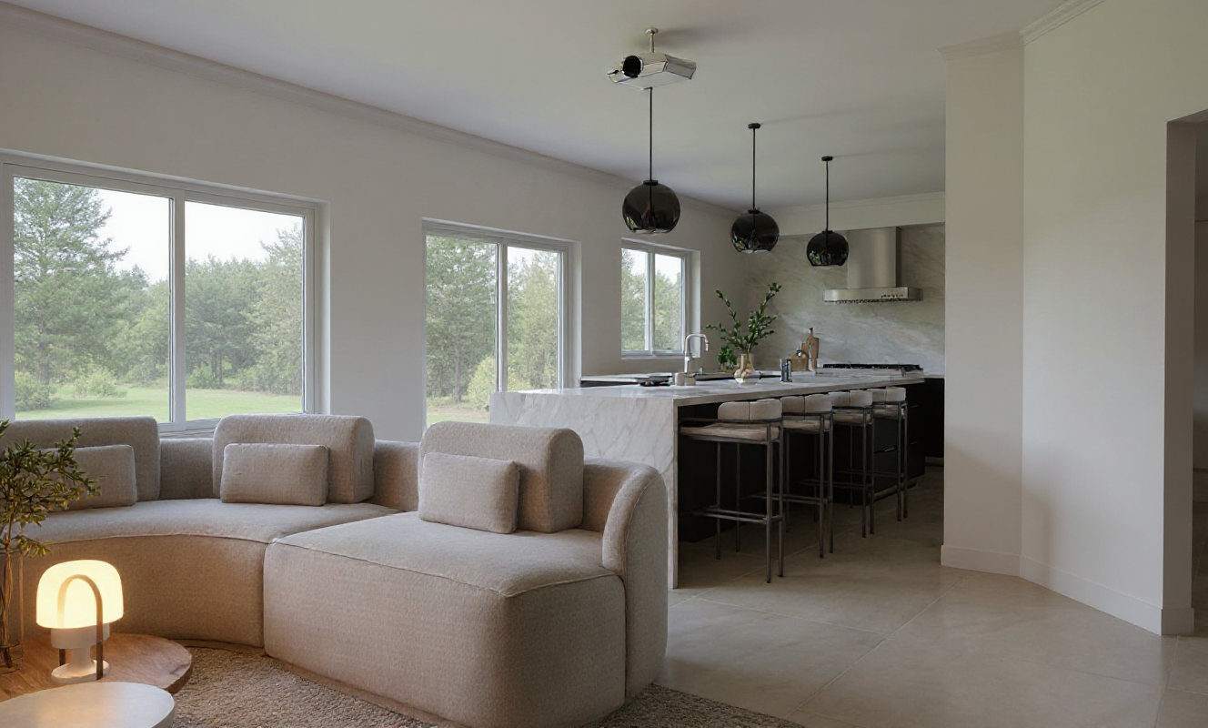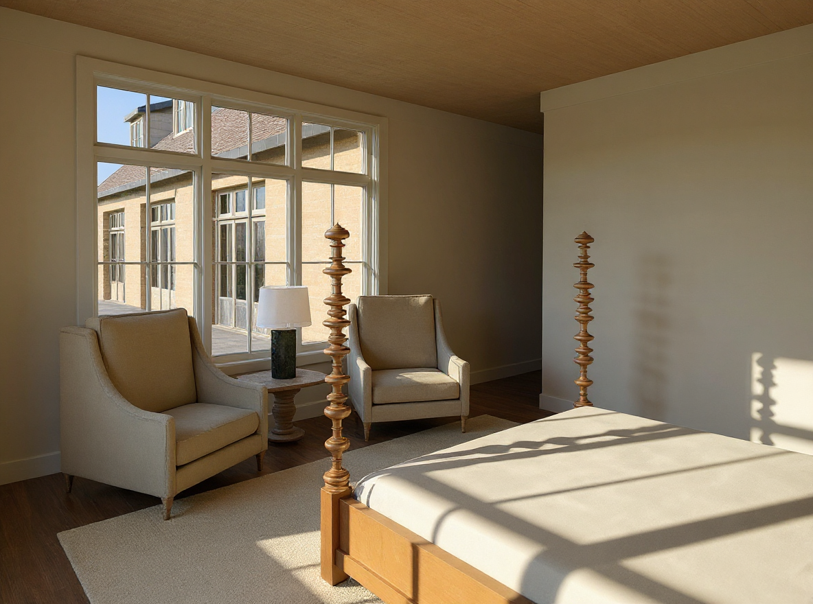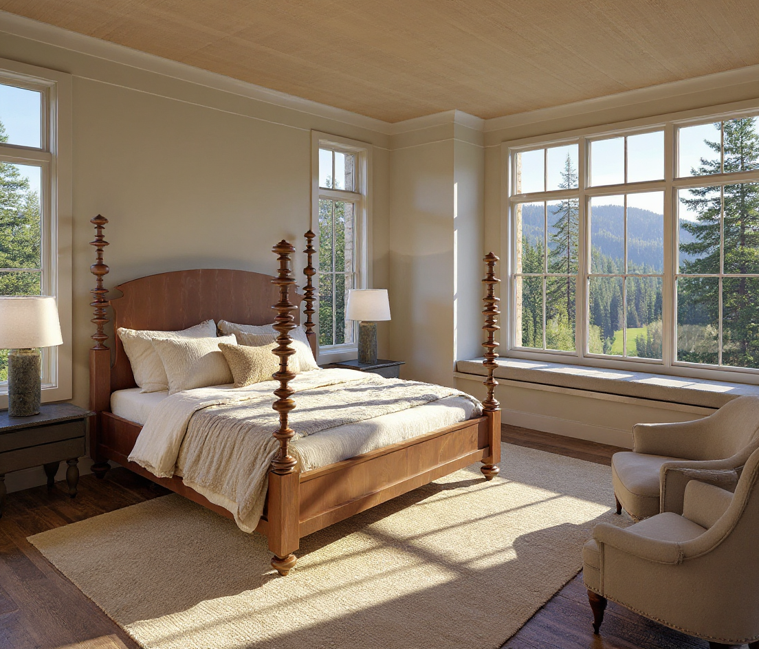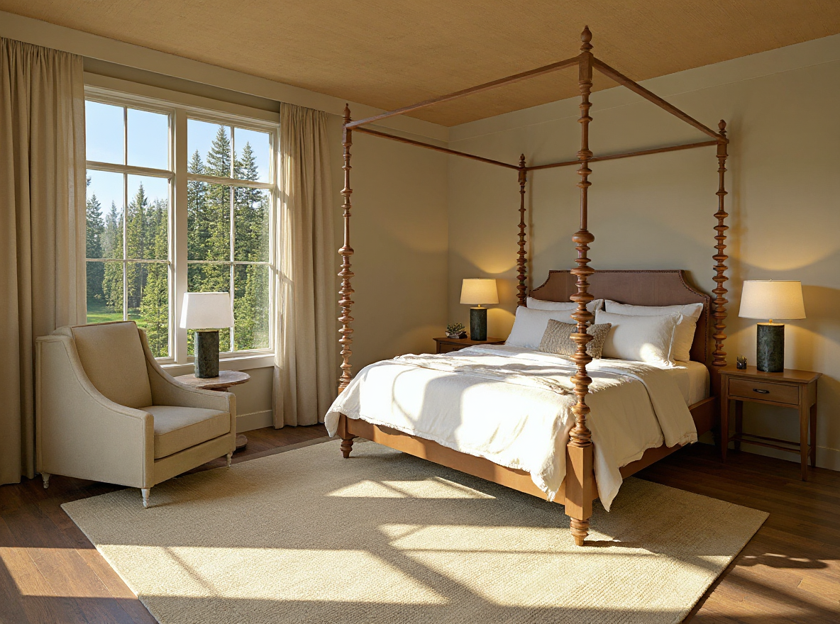large sisal rug on floor grasscloth ceiling exterior walls through window are large format stone midwest woods in background outside fluffy duvet on bed keep existing furniture at materials as is where possible