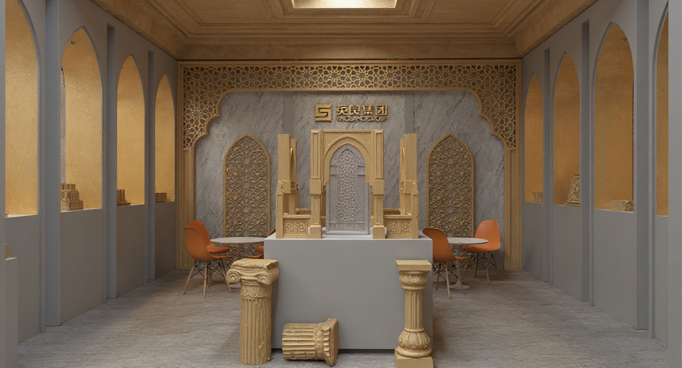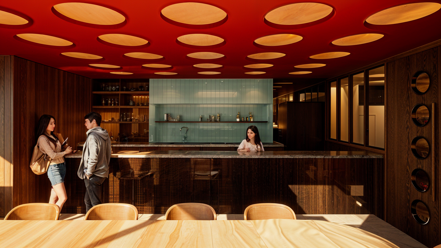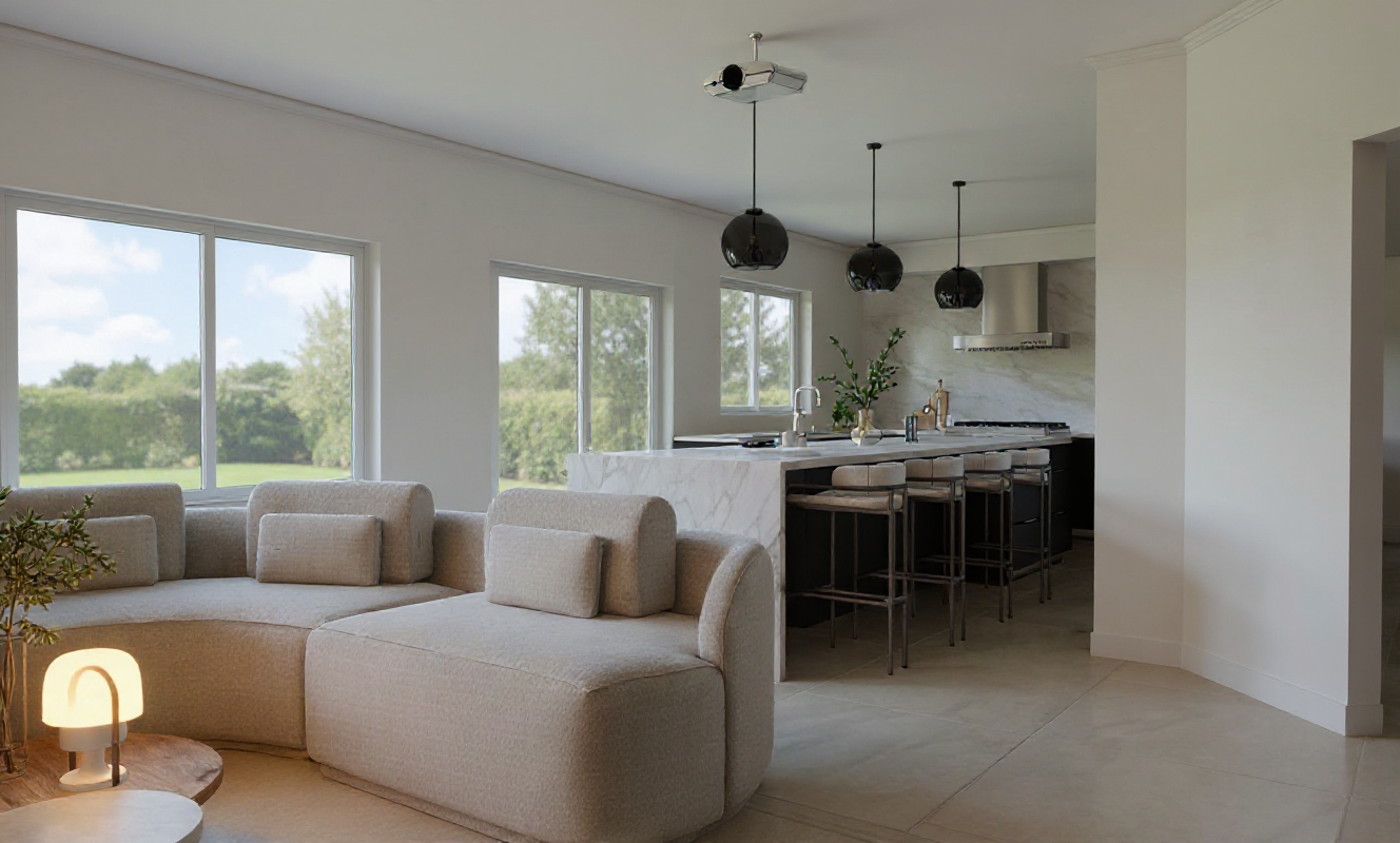 large sisal rug on floor grasscloth ceiling exterior walls through window are large format stone midwest woods in background outside fluffy duvet on bed keep existing furniture at materials as is where possible