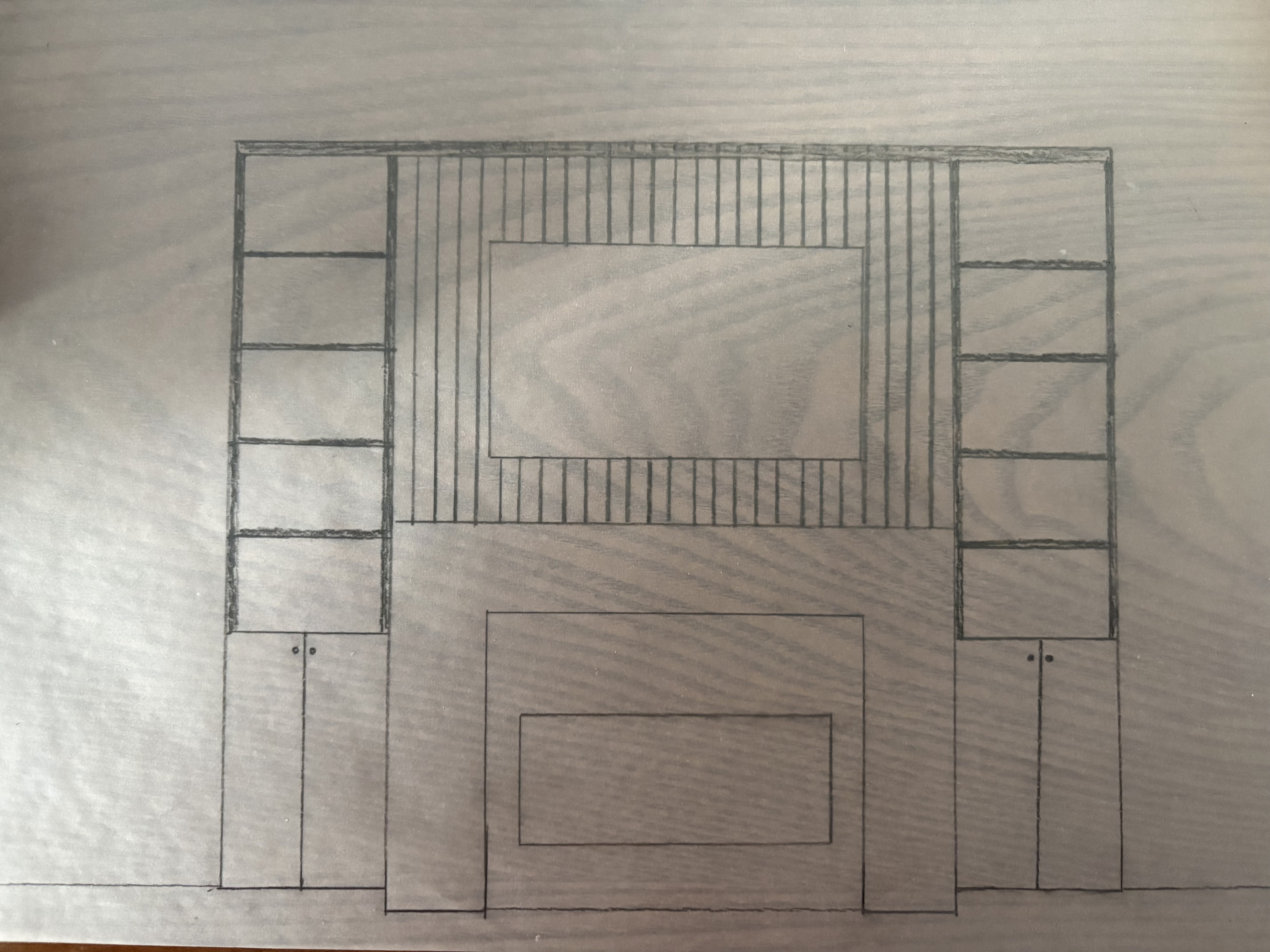 render this living room wall the fireplace insert is black while the fireplace surround is a white plaster the built in bookcases are black the vertical shiplap behind the tv is black the wall outside of the builtins is a light gray the bookcaes are flush with the fireplace there is 12 inches of wall to the right of the right bookcase and 8 feet of wall to the left of the left bookcase the ceiling height is 20 feet but there is a railing to the secod floor 12 feet high above this wall
