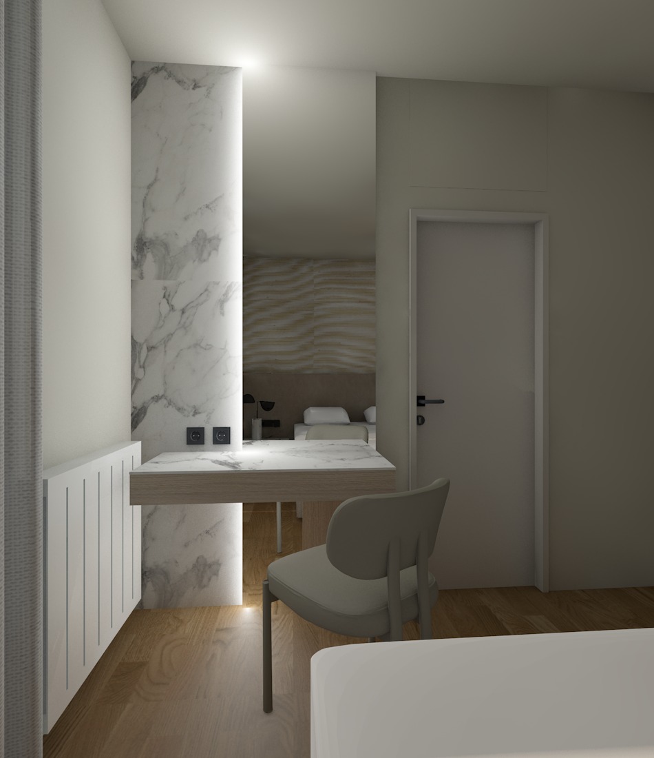 mirror includes concealed backlighting creating a soft indirect glow that enhances the atmosphere and adds depth to the composition keep the initial design the chair has boucle of white beige fabric with black metal legs