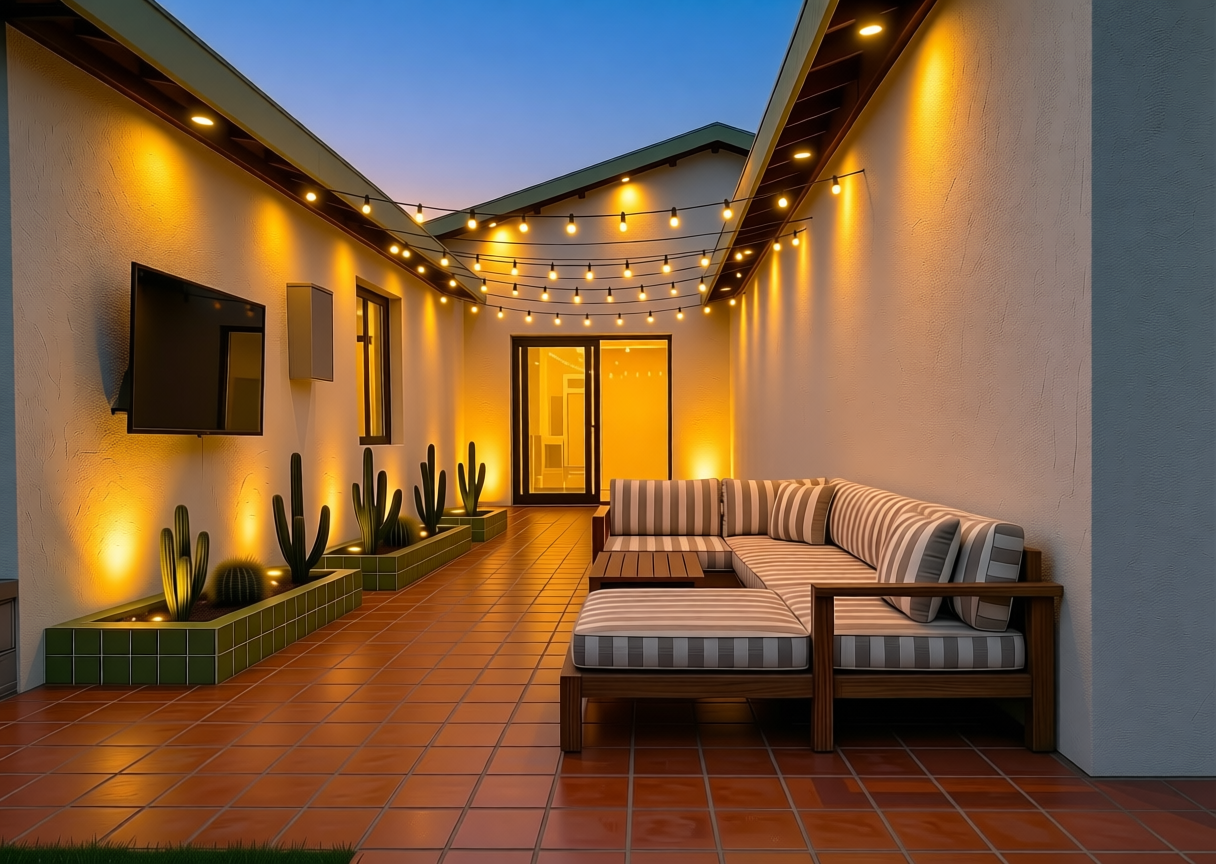 interior dy garden museum with upturned spotlights and seating neutral materials and acoustic wall panels on the back wall
