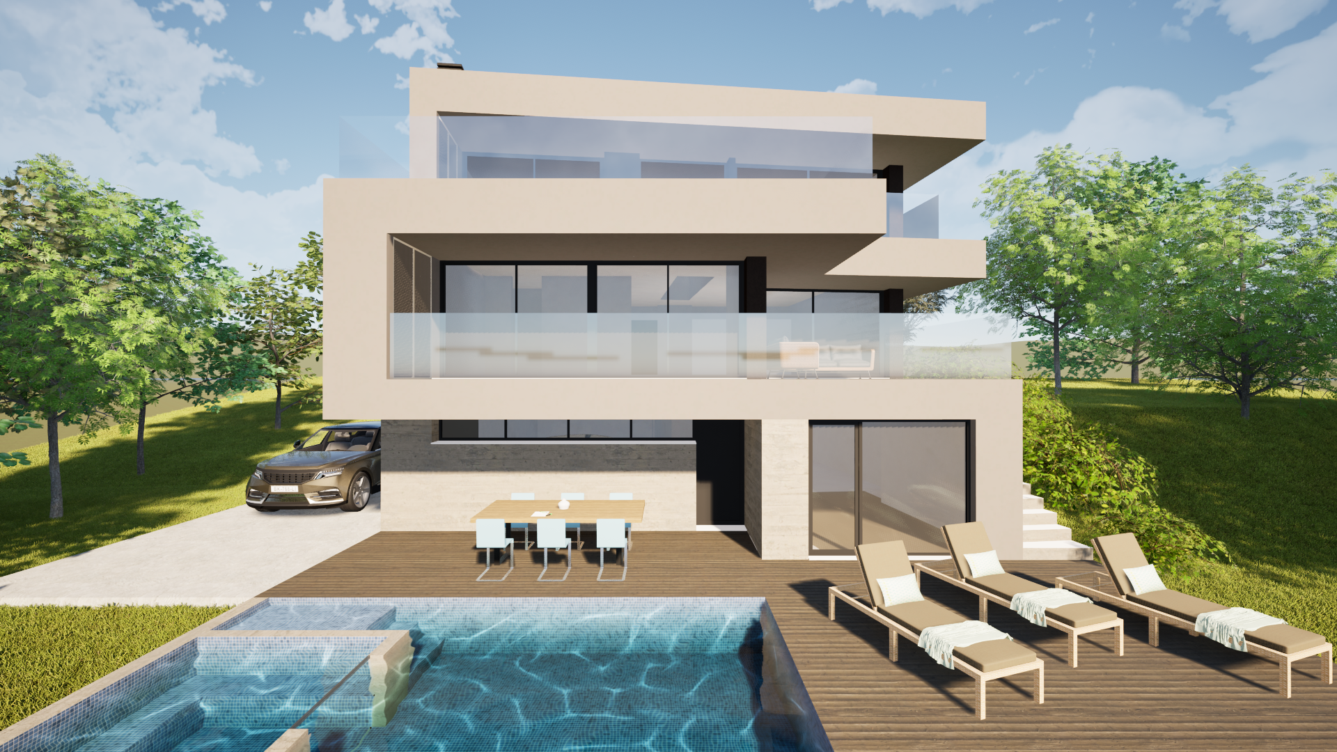 cena noturna adiciona faixas de led nos tetos das varandas adiciona luz na piscina
