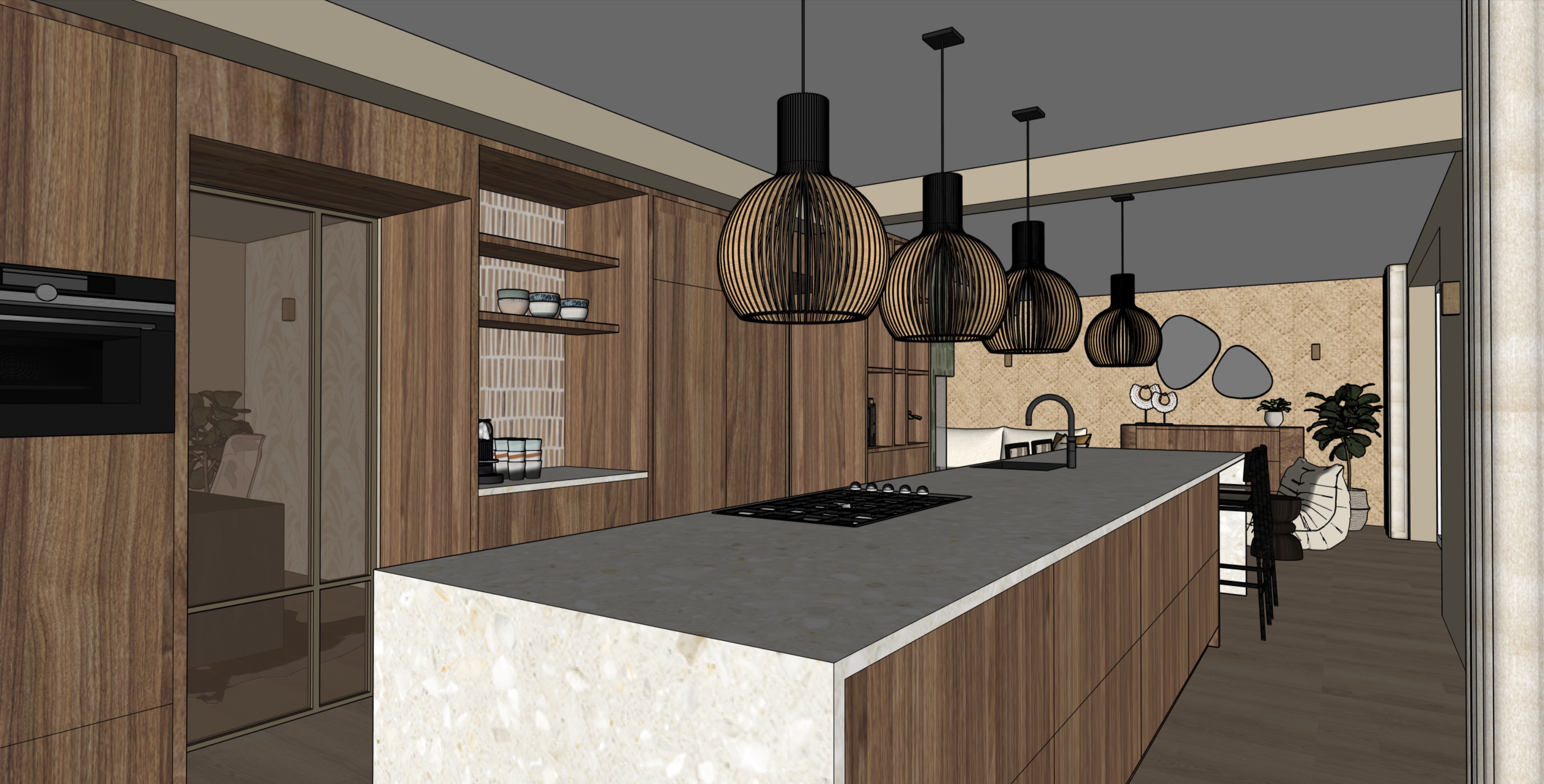 render of 3d model turn the lights on above the island and in the cupboard make the door with bronzed glass this is not a window let natural light come through the window on the right and the back which you can t see the window on the right is till the floor