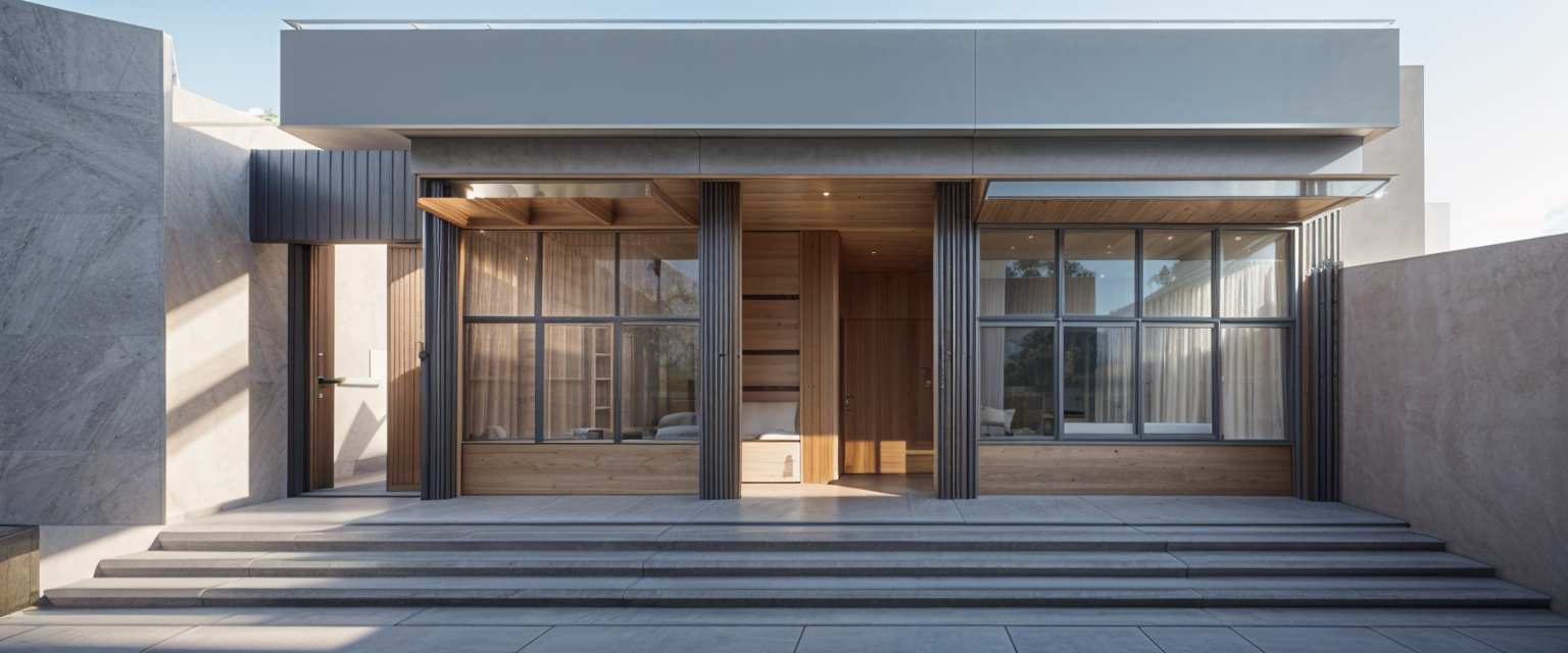 gothic interior shot create a modern spacious co working tech environment with sleek industrial design elements use muted warm grey tones for the floors and ceiling and incorporate warm wood textures for walls and shelves introduce large contemporary glass windows for natural light add people working and walking around include detailed robotic arms in glossy black and metallic silver furnish with minimalist wooden stools and pristine white chairs add subtle lighting with gentle warm tones creating a sophisticated and futuristic atmosphere architecture