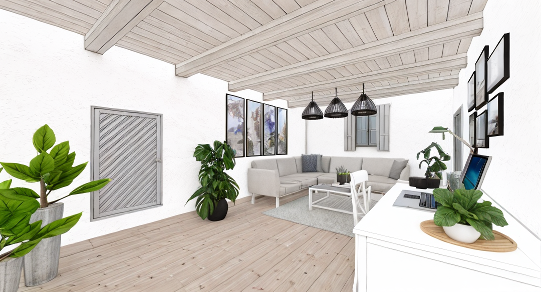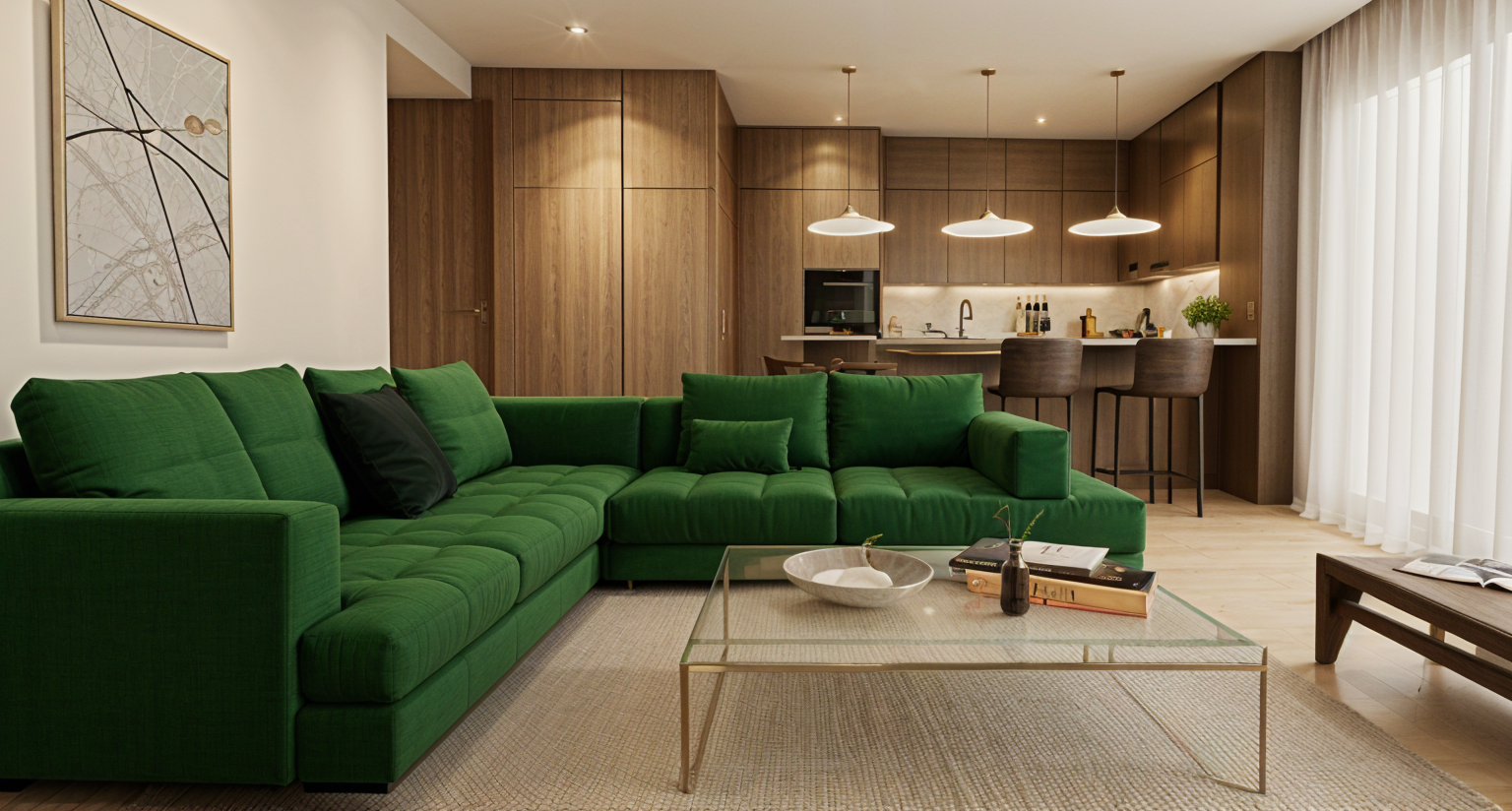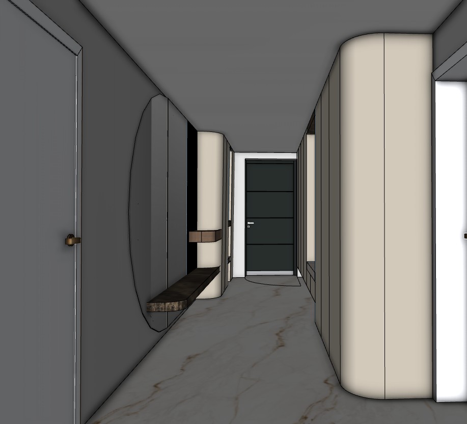 interior shot render a modern minimalist hallway with a soft ambient atmosphere use a neutral color palette with warm beige closets white walls and a contrasting dark brown door the floor is light gray marble with subtle brown veining incorporate a large round mirror with a thin black frame on the wall to the left add a brown marble floating shelf with rich dark brown hues below the mirror keep the bench curved at the end enhance the lighting for a cozy and inviting ambiance