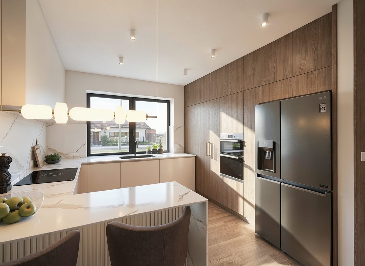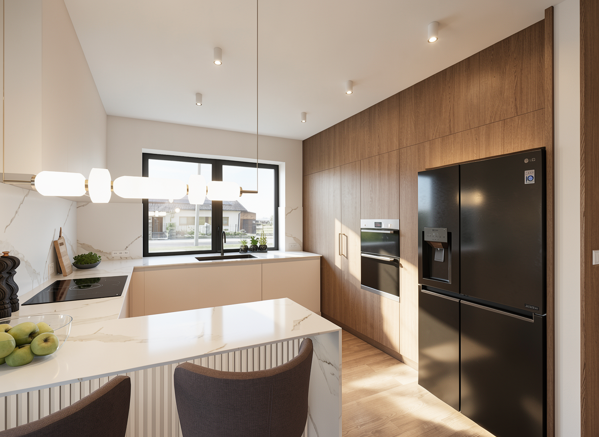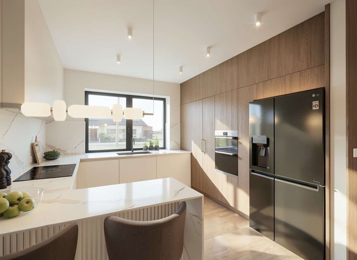 international style interior shot create a photorealistic interior visualization based strictly on the provided image do not add remove or modify any elements materials furniture or layout do not add any new windows anywhere else do not place windows on other walls ensure the sunlight reflection on the glass is smooth and continuous without any grid lines or breaks maintain correct scale and proportions use physically accurate lighting with soft global illumination all lamps are turned on and emit warm light with visible light sources keep natural exposure consistent with the original image use high quality realistic textures with precise detail ensure accurate reflections and soft shadows do not apply any stylization or artistic effects the result must be strictly photorealistic and match the original scene as closely as possible add four evenly spaced surface mounted white four circle spotlights to the ceiling with a simple modern design and make sure the lights are turned on emitting soft natural lighting on the right side there is a framed mirror and on the left side there is a framed tv ceilimng is white add sunlight reflections architecture
