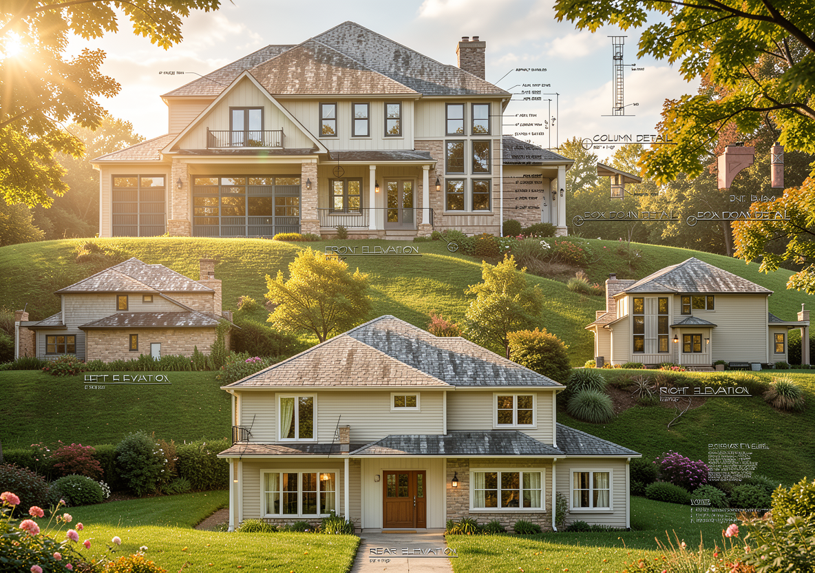 a modern one story farmhouse with dark gray horizontal siding black standing seam metal roof on small roofs black slate shingled roof black windows and door white horizontal siding on right and left of door a lush dense forest of tall mixed evergreens and hardwoods place the sun behind the trees so warm golden sunlight beams through the branches casting soft rays and subtle dappled highlights across the patio siding and grass create ultra realistic lighting crisp shadows detailed textures in the wood siding and glass reflections and a vibrant clear sky with light atmospheric depth render in hyper realistic architectural visualization quality 8k resolution