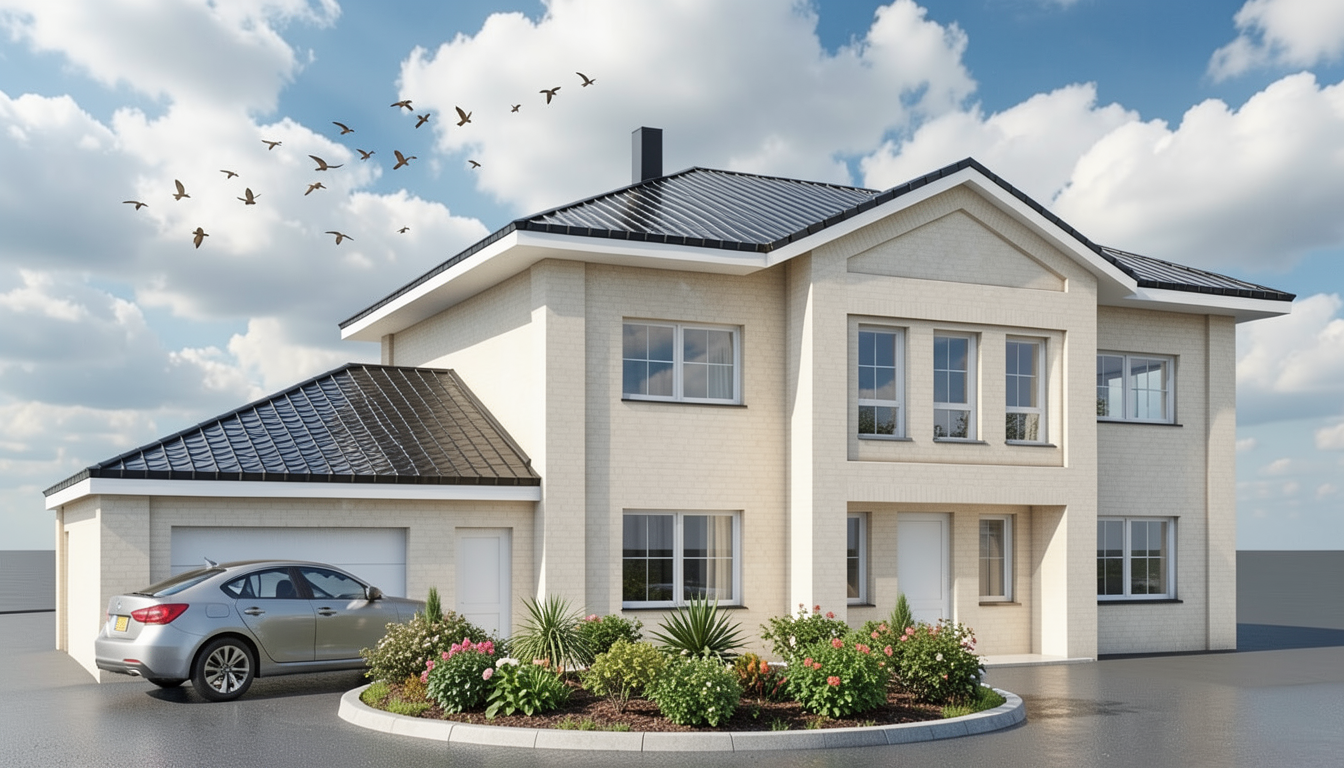 only some birds on sky cloudy shiny day black roof tiles circle planted in front of the house car drives in circle