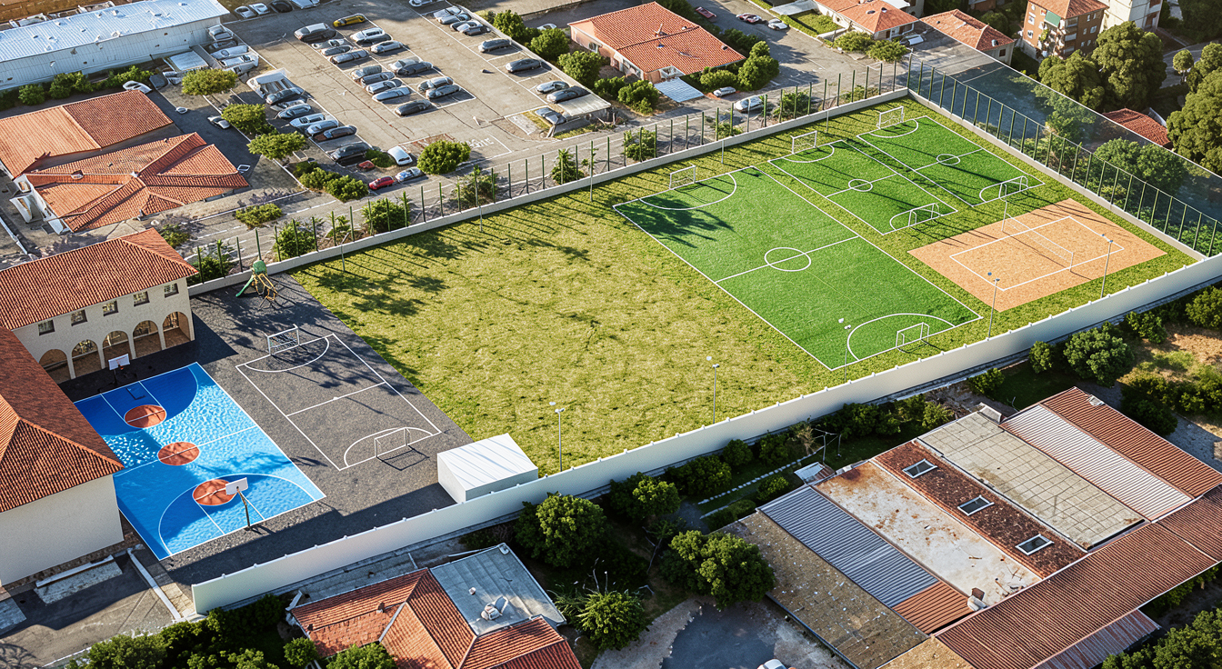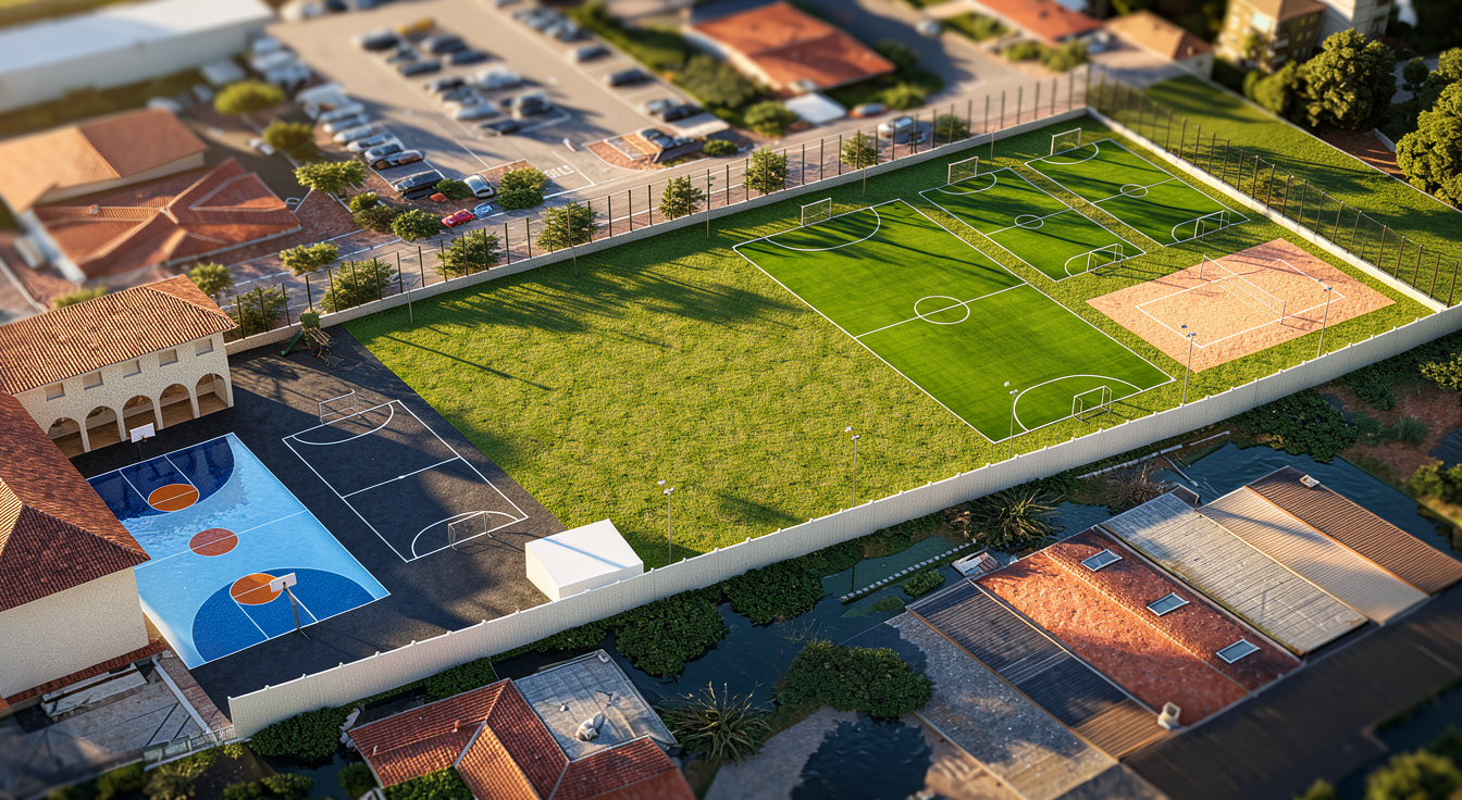 ultra realistic aerial masterplan integrated into urban context bird s eye satellite view similar to google earth a large outdoor sports complex with multiple soccer fields with green grass and white markings basketball courts with colored surfaces and beach volleyball courts with bright sand and nets the sports facilities are organized in a clear geometric layout with pedestrian paths trees lighting poles small stands and service buildings surrounding urban environment with residential blocks streets parking areas sidewalks parks and urban greenery realistic satellite perspective high altitude drone view accurate urban scale realistic shadows detailed textures photorealistic environment google earth style rendering 8k resolution
