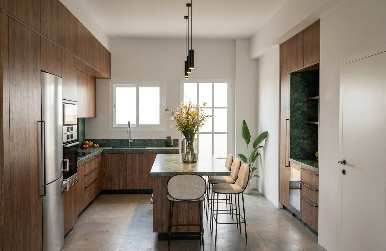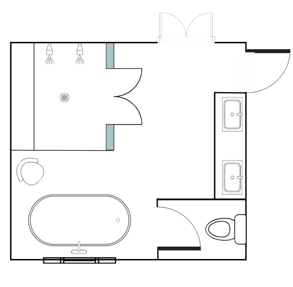 preserve the exact layout camera angle and placement of all elements do not move or redesign anything enhance the bathroom with realistic finishes light wood flooring full height tiled shower walls to the ceiling warm wooden vanities light colored quartz countertops subtle greige colored walls brushed nickel plumbing fixtures large mirrors over the sinks add soft subtle warm lighting