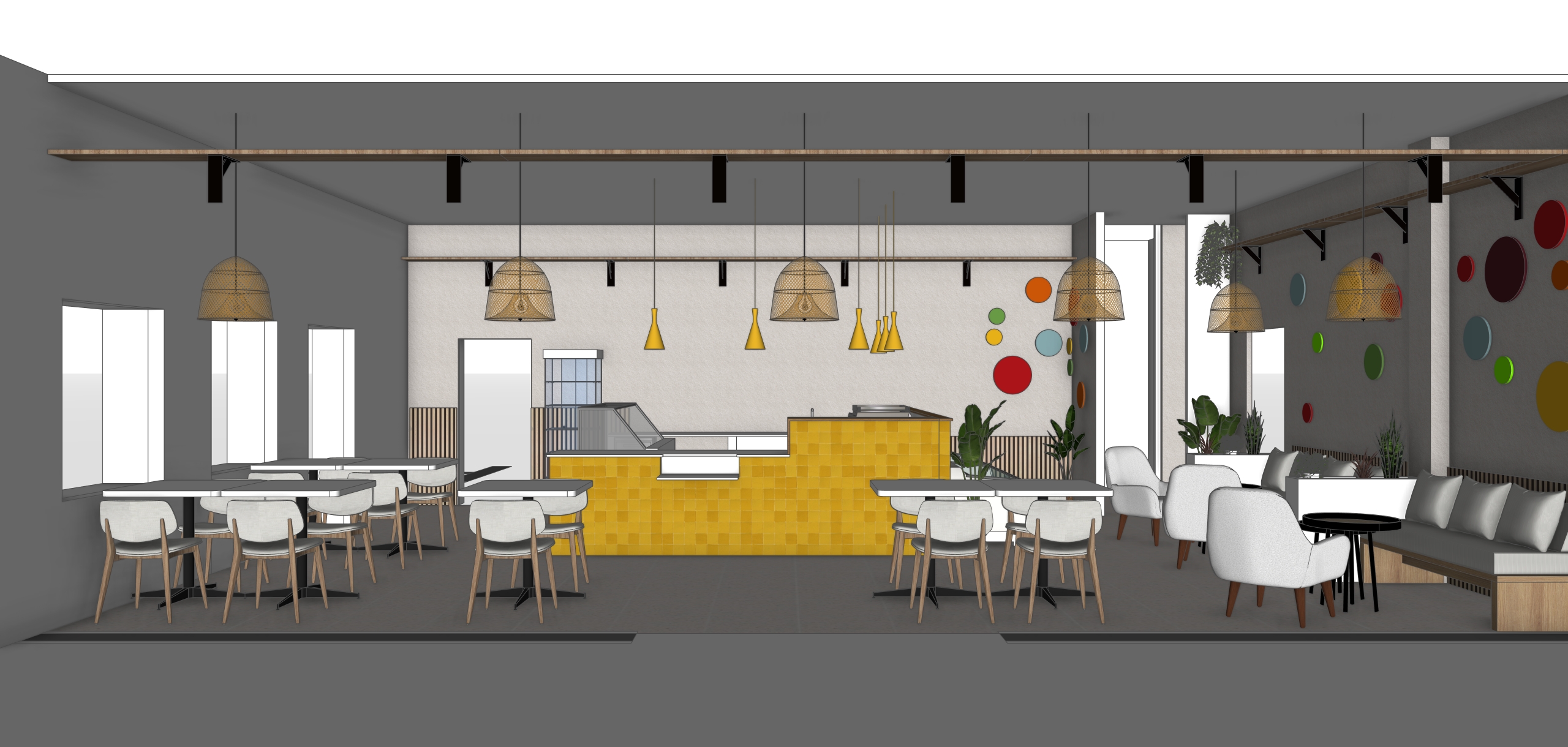 interieur render light shadows from the left side of the image keep textures and coulours materials light suspensions add plants to shelves backround none add menu frames on backwall