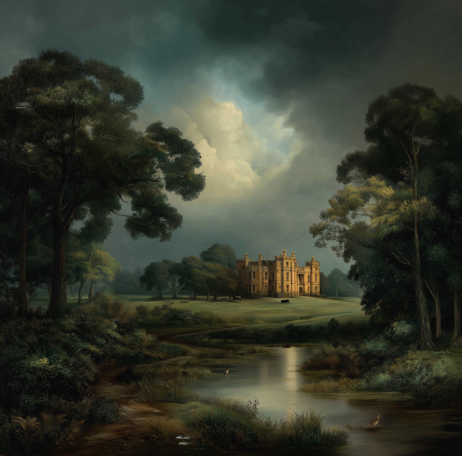 make into a vintage old oil painting with stags old and vintage dark and moody