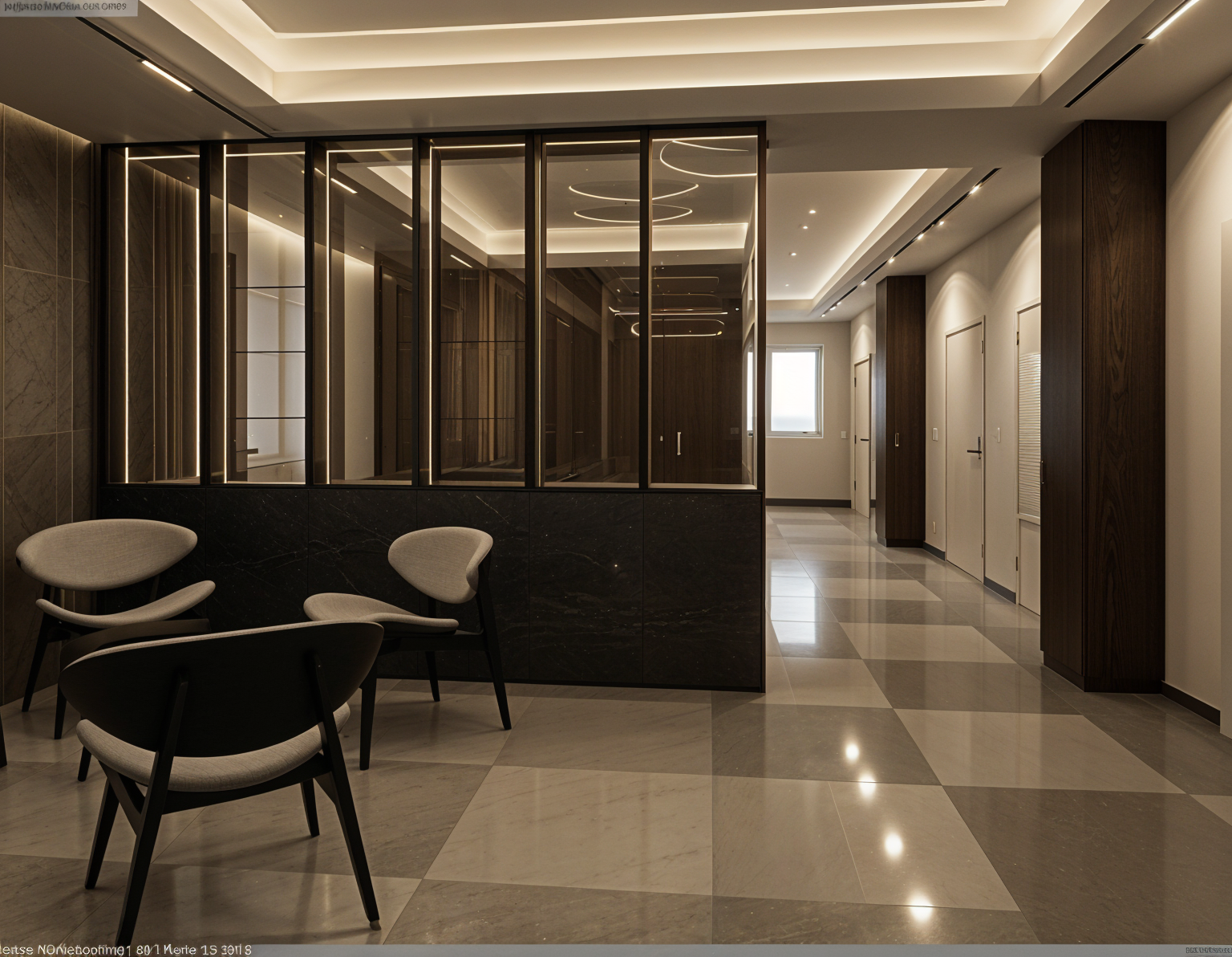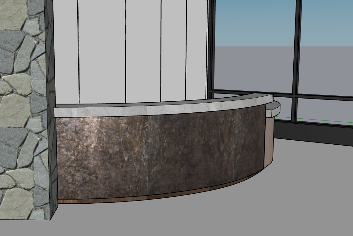 render a modern interior reception desk scene with a honed taj mahal stone counter in a soft gray complemented by a ragged shagreen bronze front panel and rift white oak side panel use a sleek dark frame for the window with a lush golf course visible add a natural flagstone wall on one side in varying shades of gray for a rustic touch create a tranquil and inviting atmosphere with diffused natural light gently illuminating the space