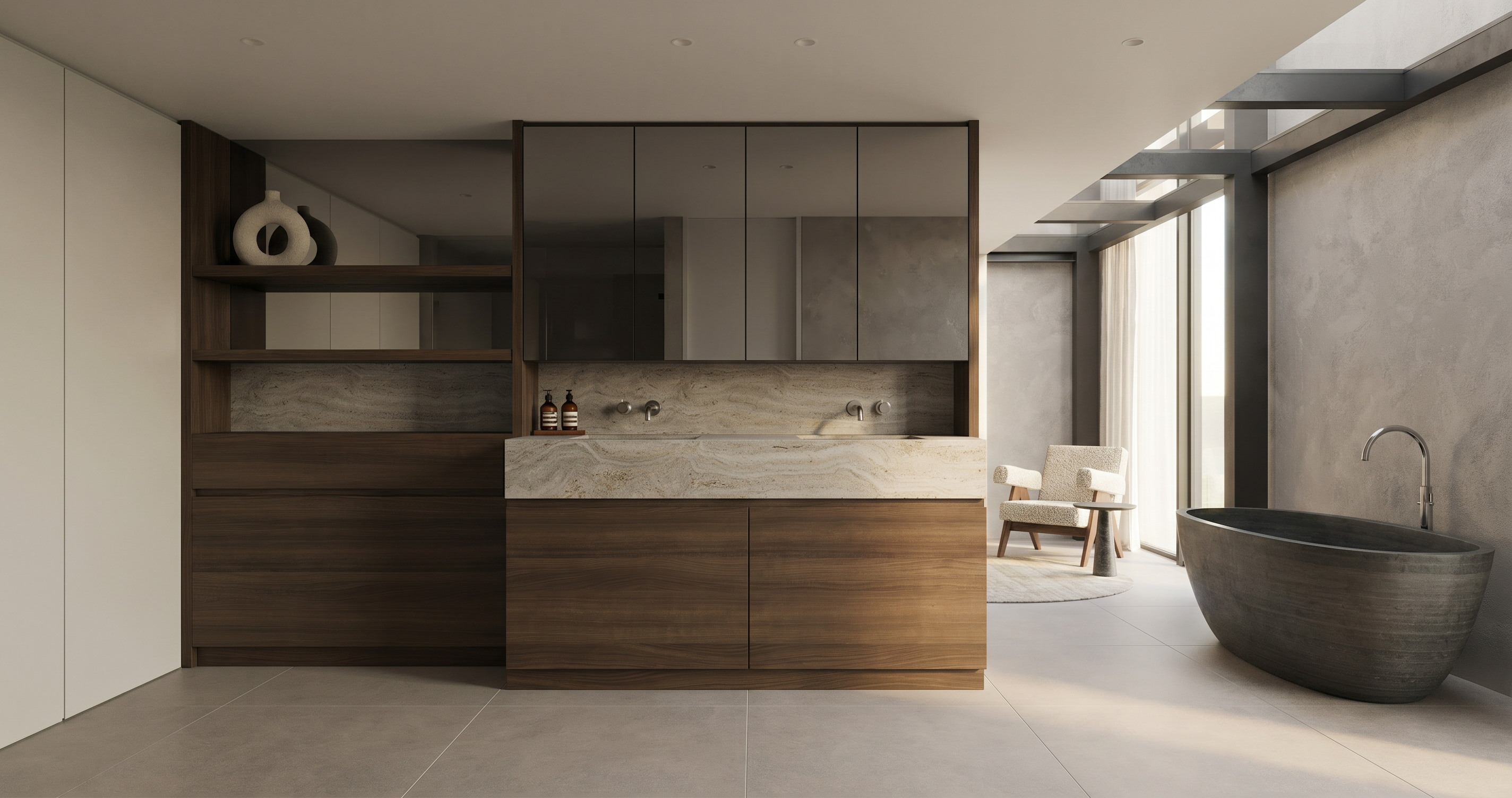 watercolour front view of bungalow with stepped flat roof extension plants overhanging roof edge solar panels on the roof grey limestone patio floor to ceiling glass windows with burnt larch cladding