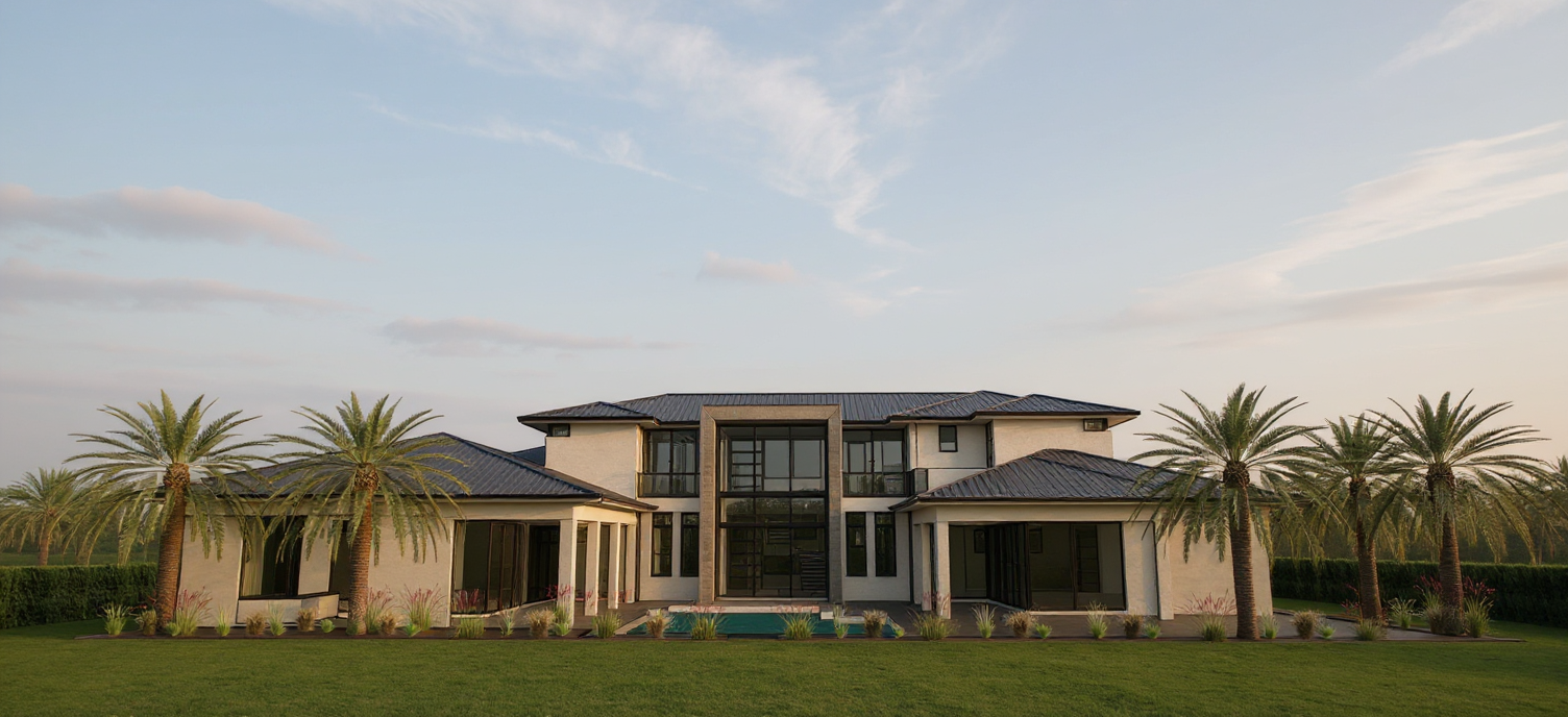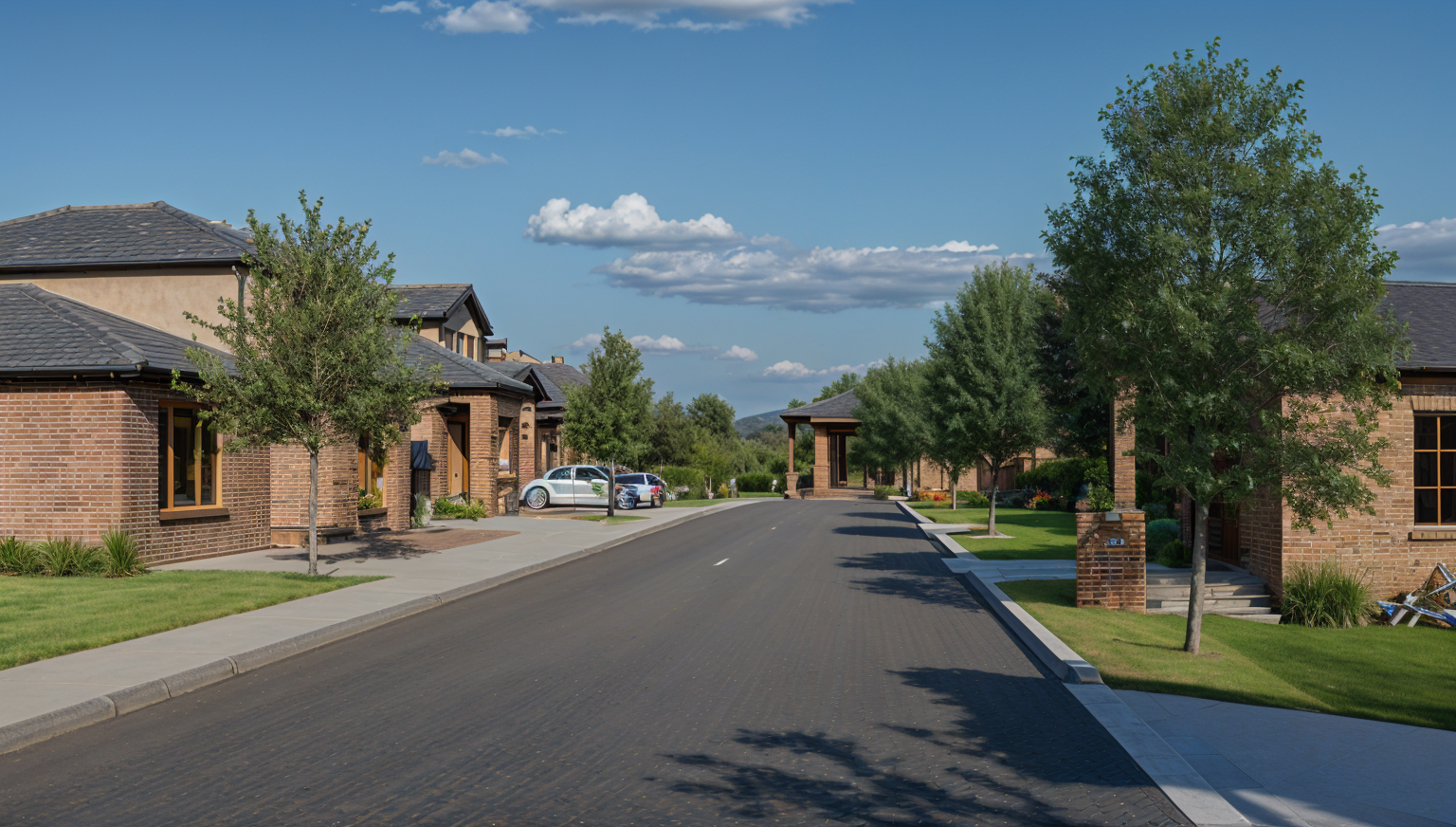 generate a beautiful suburban street scene featuring modern craftsman style houses with tan stucco walls and gray shingle roofs each home should be in the same style with slightly different wall colors the atmosphere should be serene and inviting with a bright blue sky filled with soft fluffy clouds include lush green trees lining the street casting gentle shadows the road should be a rich smooth dark gray while the sidewalks are a clean light gray add warm natural sunlight to create a tranquil and welcoming neighborhood ambiance architecture