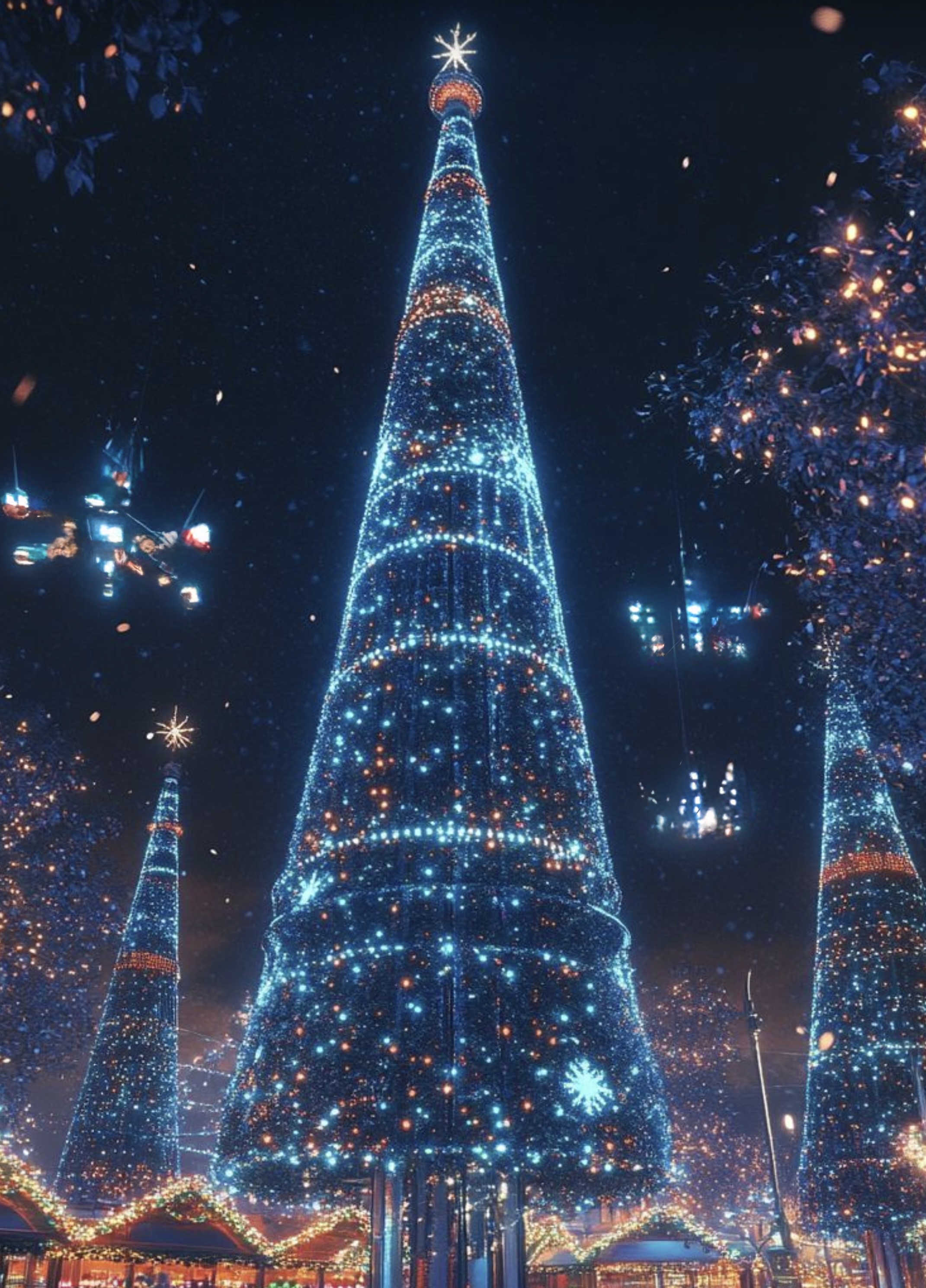 change this christmas tree with red and purple these and add exciting lighting effect such as search light beams flickering lights with the same color lights