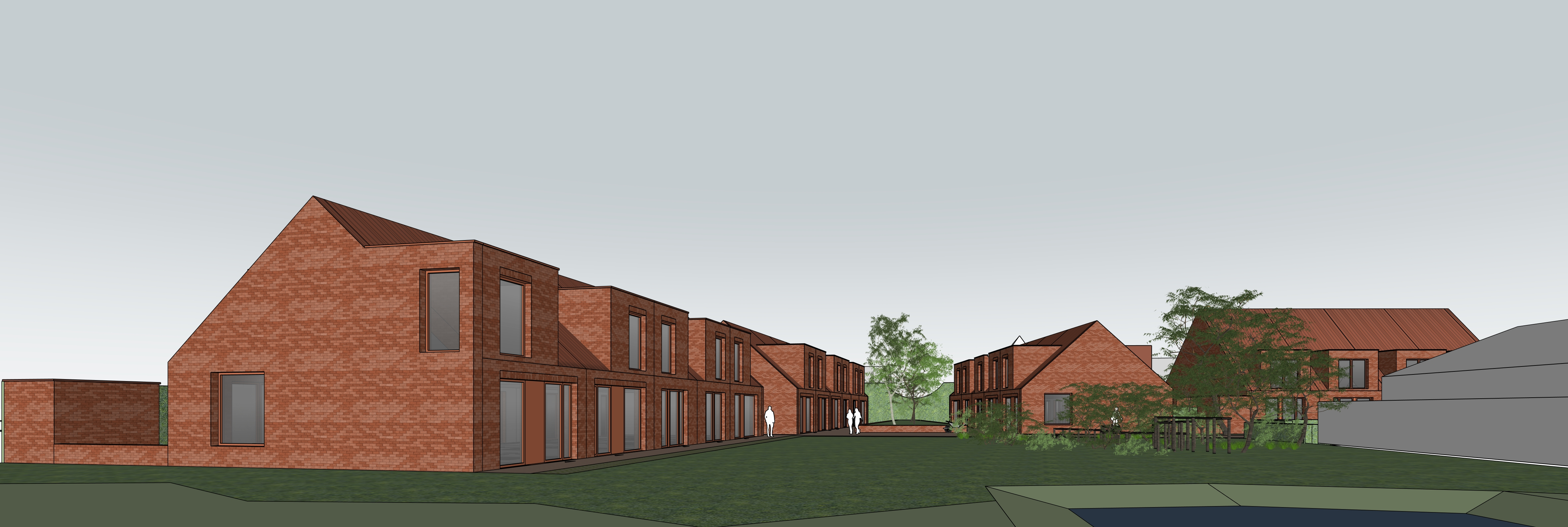 a calm and inviting courtyard composed of contemporary brick buildings with pitched roofs and simple refined geometries the roofs are clad in red brown vertical panels with a matte weathered finish the fa ades are made from red brown brick with a more uniform less variegated tone the window and door frames are slightly redder in color creating a warm contrast with the masonry the sides of the dormers are constructed in matching brick integrating them seamlessly with the fa ades the paved courtyard surface is replaced by a natural meadow landscape characterized by tall grasses low herbaceous plants and open patches that create an inviting habitat for meadow birds the ground feels soft wild and ecologically rich blending gently with the surrounding architecture a small courtyard tree with warm toned foliage adds seasonal color soft diffused daylight under an overcast sky creates a serene and balanced atmosphere a few people are casually present enhancing the quiet sense of community the overall mood is peaceful natural and subtly rustic with photorealistic materials high end architectural visualization quality and a composition that highlights ecological softness and harmonious outdoor living
