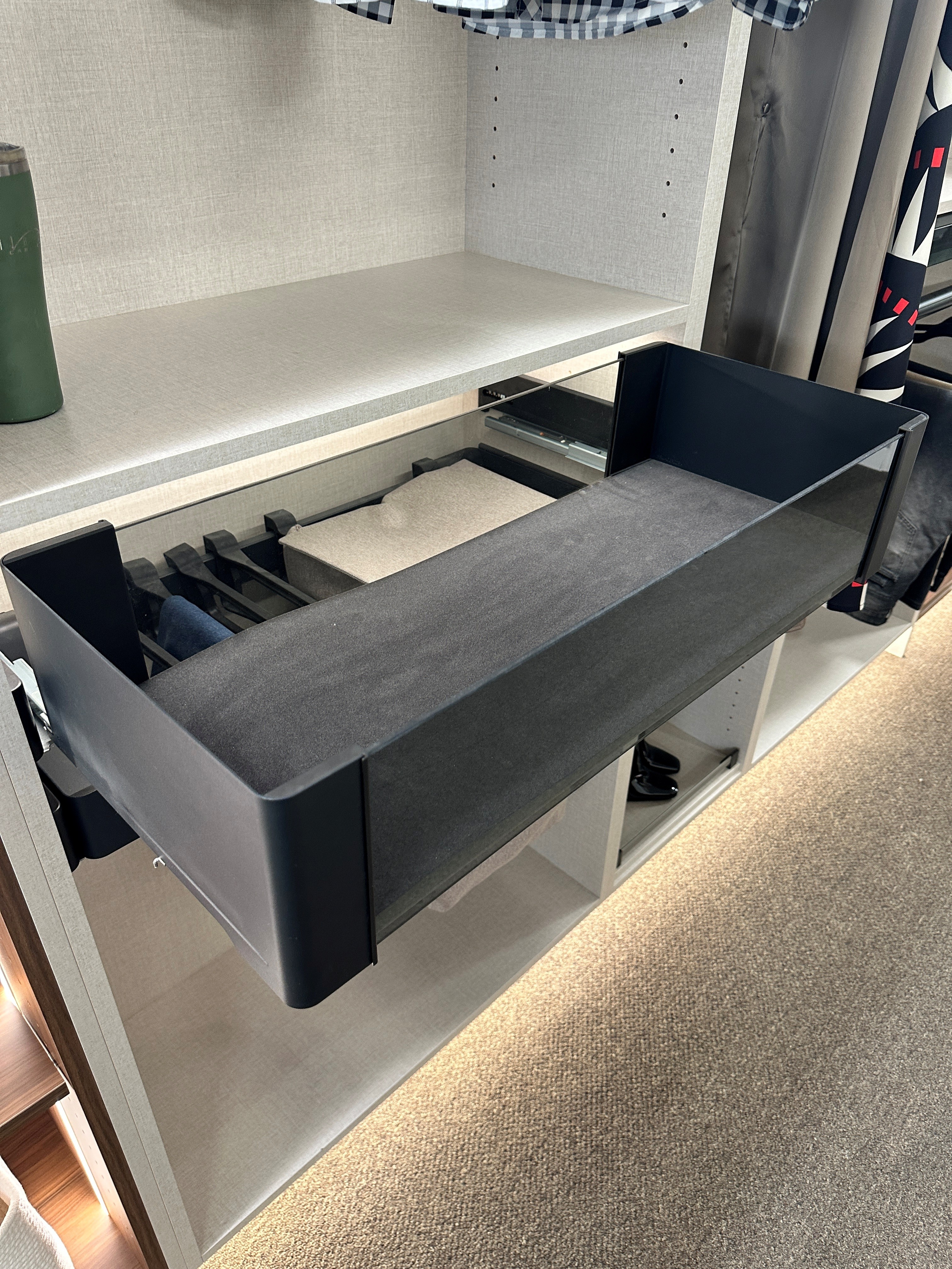 add natural light add folded clothes on the top shelf put watches in the glass rollout change the carpet to white luxurious