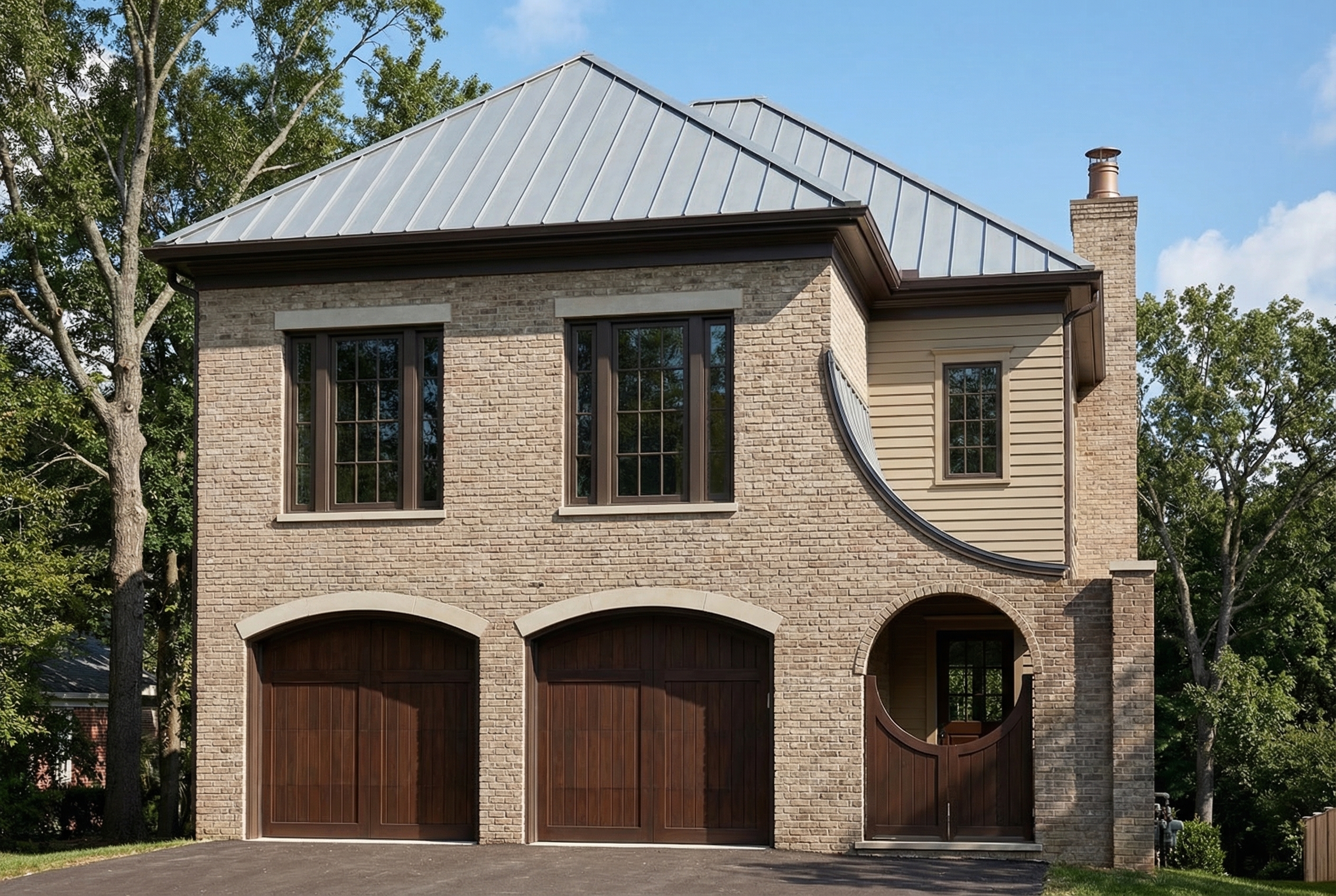 change trim around window in lap siding to be a slightly darker color make chimney cap a darker bronze color add vegetation strip between driveway and create a walkway separate from the driveway show driveway as concrete bordered with brick pavers