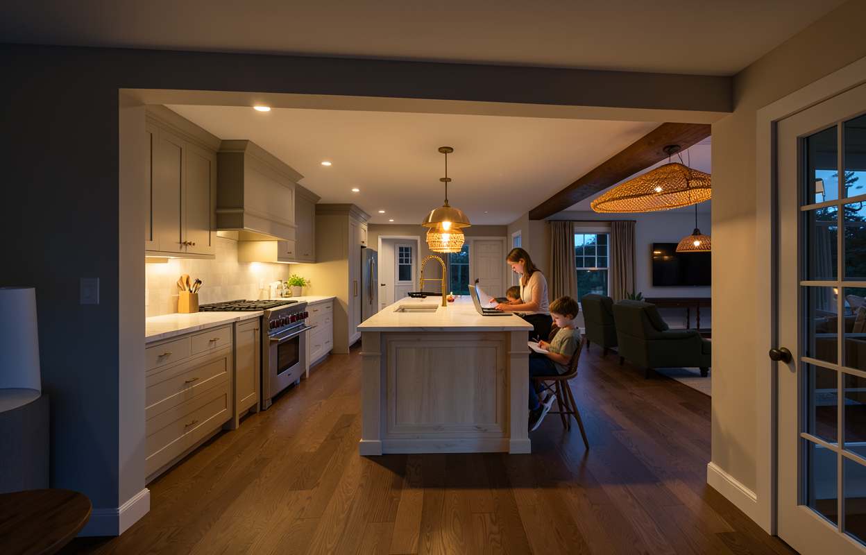 convert this floor plan into a realistic isometric 3d view of a full house show the space from an elevated angle with furniture walls and details visible convert this floor plan into a realistic isometric 3d view show the space from a top down view with walls furniture and details visible carpet on the stairs family room and bedroom light wood flooring in the bathroom white cabinetry and white countertops d white trim only finish the bedroom bathroom and family room remove the porch and the garage use the same furniture as shows on the plan do not change the orientation of the floorplan