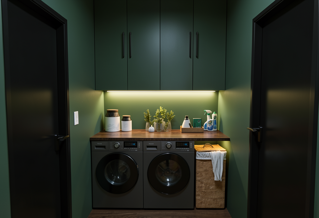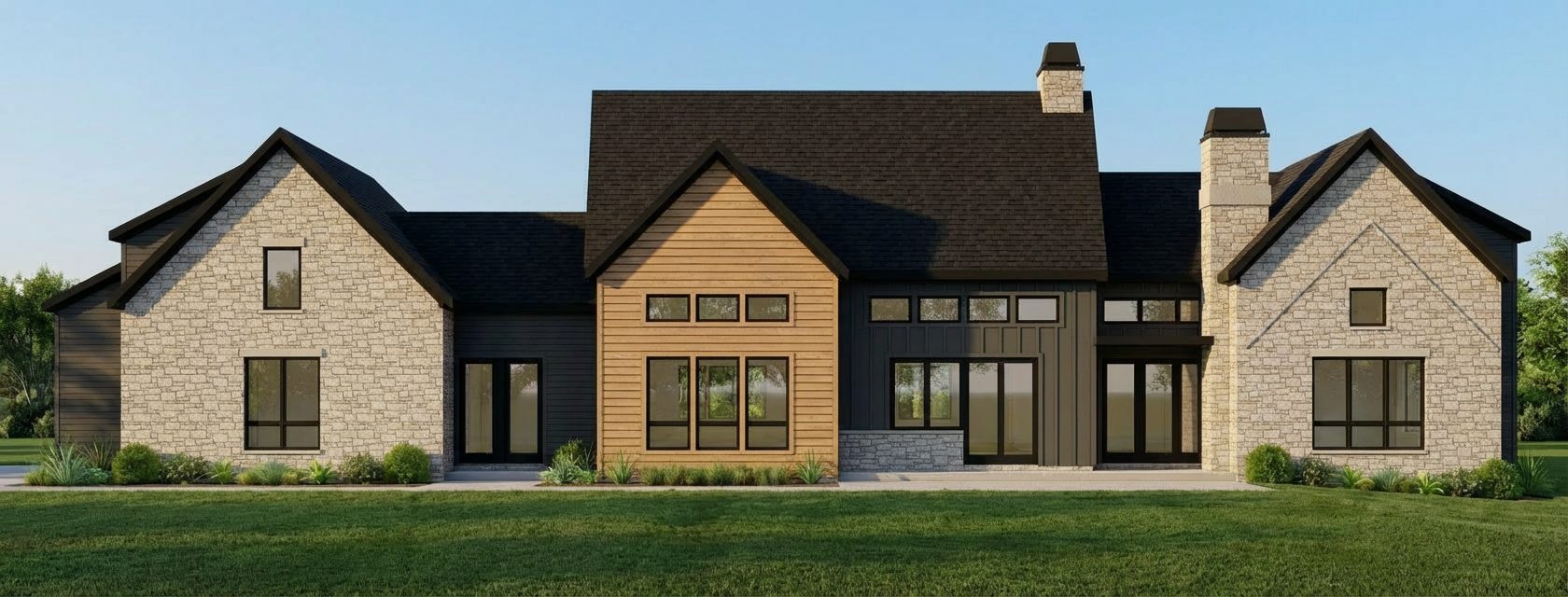 create photorealistic rendering of this kitchen add led lighting to glass cabinets and under slab shelf under hood add linen roman shades to windows and landscaping in backyard change green bottom cabinets to farrow and ball brown broccoli paint color change flooring to noce colored tumbled travertine floors with versalles pattern
