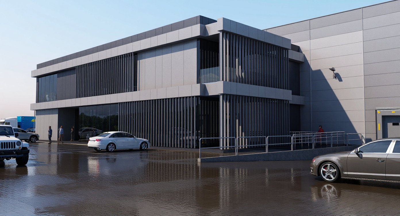 put this steel outdoor kitchen on a patio with grey pavers and a white stucco wall