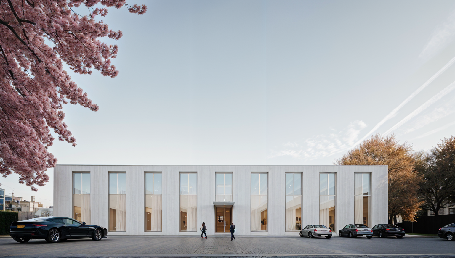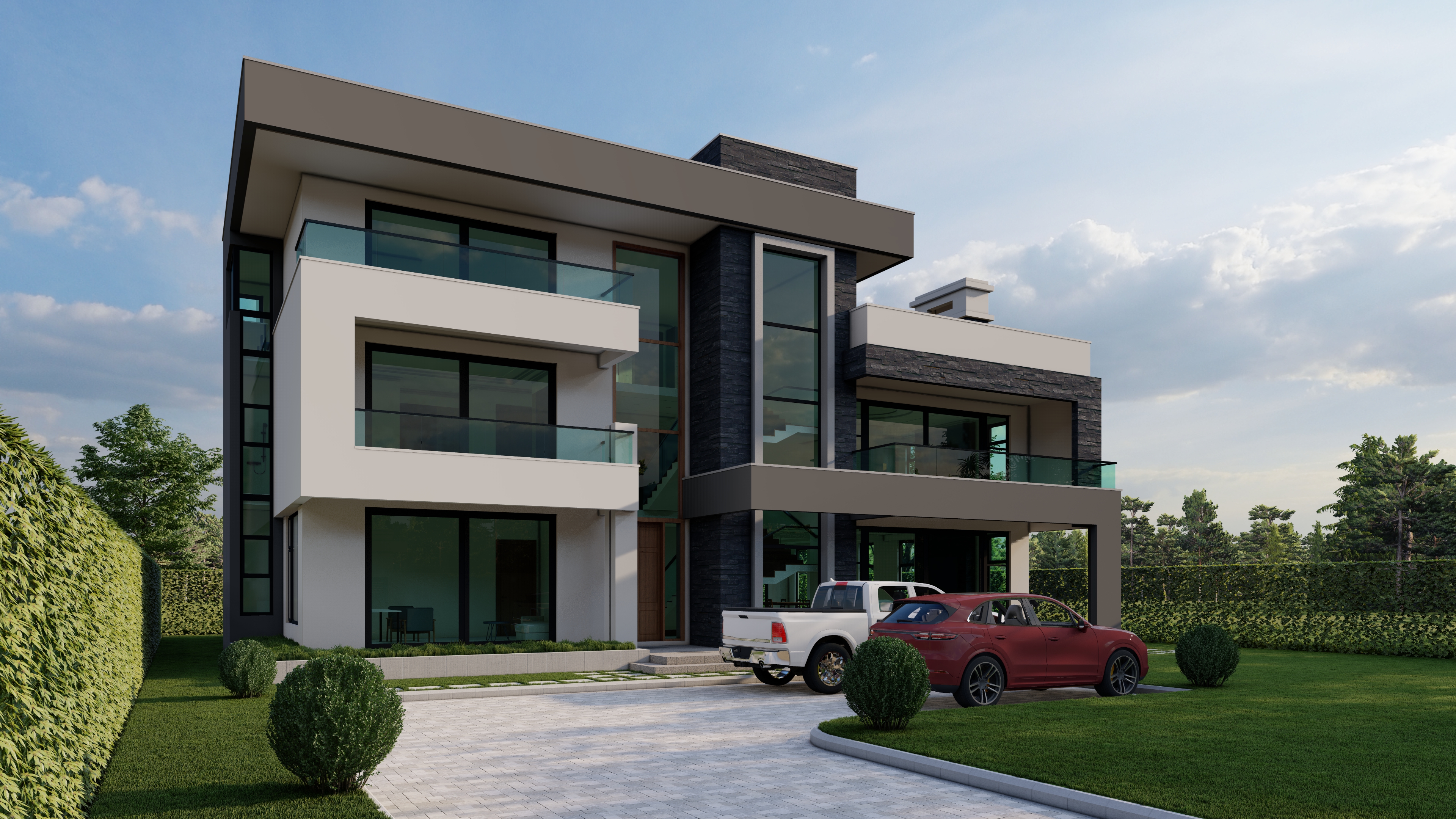 create a stunning modern villa with a sleek minimalist design use a soft cream color for the building facade complemented by dark gray accents for window frames and railings incorporate a textured stone wall in a natural beige tone the atmosphere should be serene and inviting with vibrant green grass covering the spacious lawn add a tranquil blue swimming pool in the foreground reflecting a clear blue sky with soft fluffy white clouds surround the scene with lush green trees and tropical plants for a refreshing feel