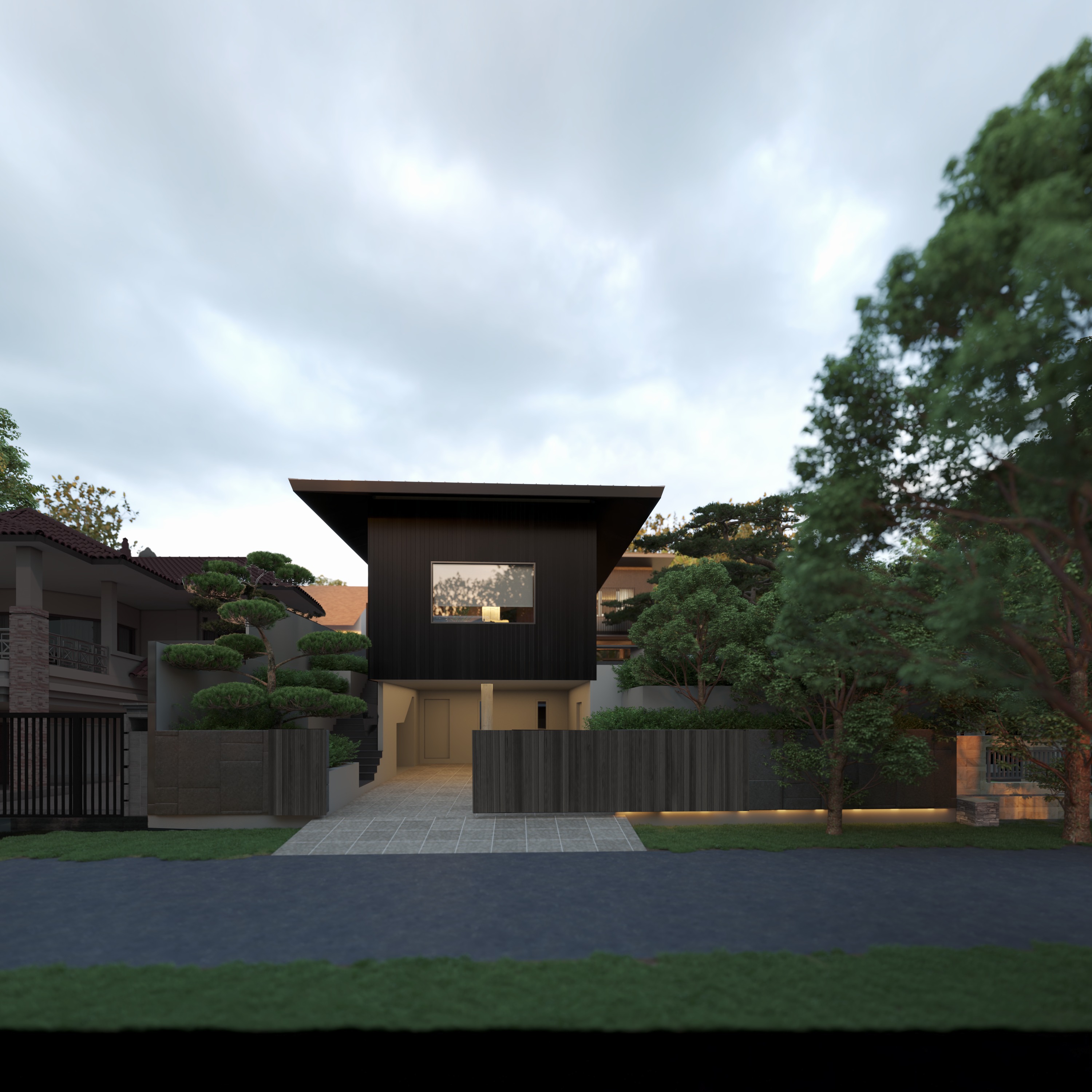 enhance the realistic texture and night lighting set artificial indirect lighting in the building and neighborhood maintain the elements and angle of the picture do not use lighting on the roof