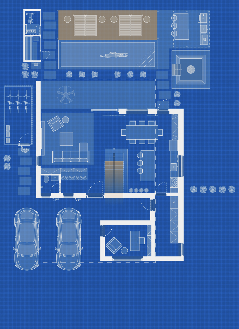 convert this floor plan into a realistic isometric 3d view of a full house show the space from an elevated angle with furniture walls and details visible inside floor light beige microcement luxury black accents and dark wood accents wood furniture and mostly beige furniture outside mediteranean with small rocks less grass and rosemary lavender plants bali vibe outside two black teslas parked in front outside pool sunbed sauna mini gym outside kichen with bbq and pizza oven and sunken fireplace use the same furniture as shows on the plan do not change the orientation of the floorplan