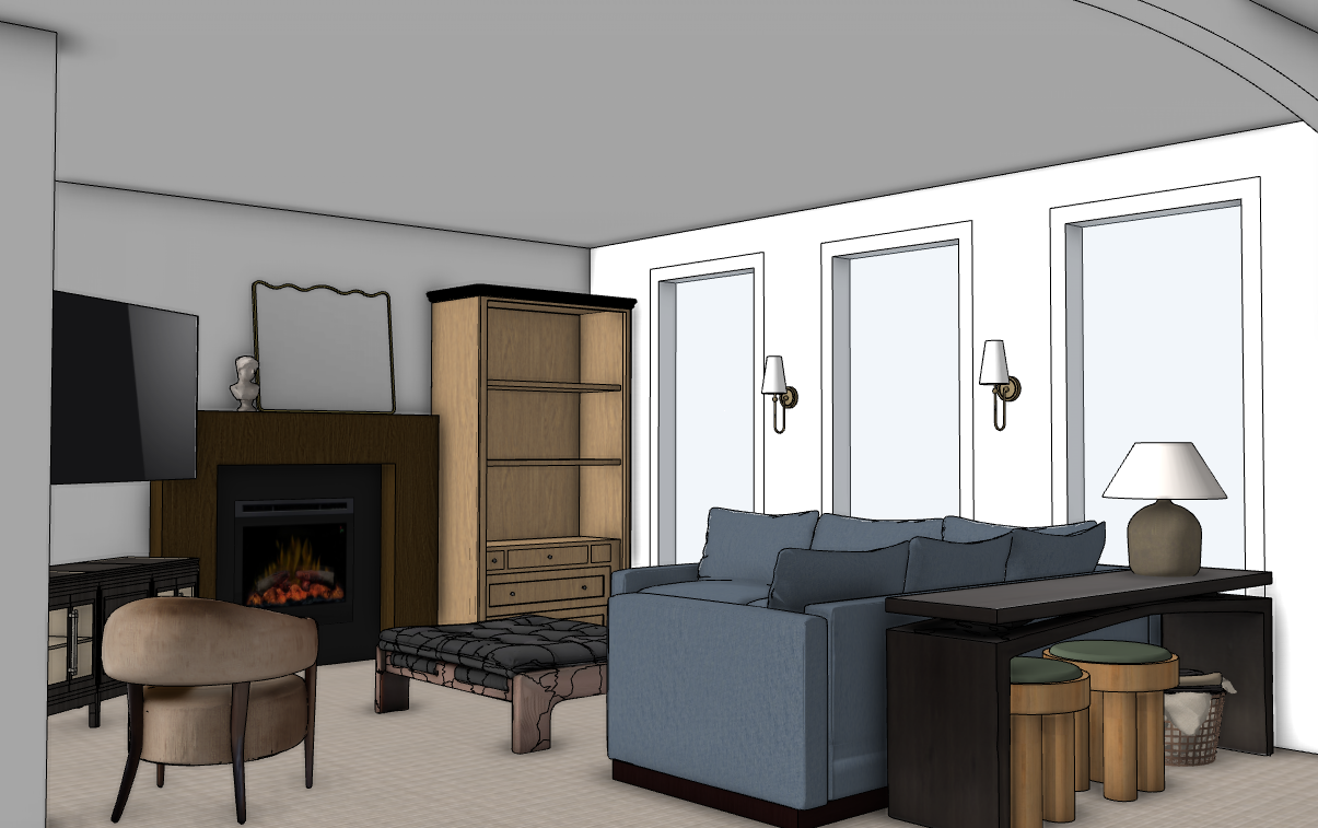 create a photorealistic render from the model add recessed lighting to the ceiling keep the scale size and placement of what s shown do not change the wood tone colors and keep consistent with the model tone