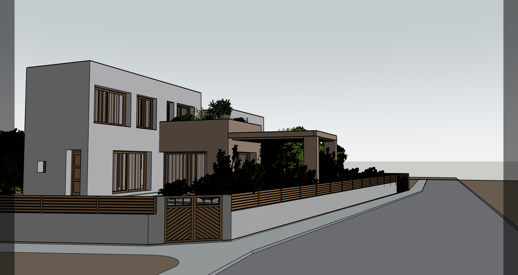 render with slightly rough cement concrete grey on the grey part and traditional greek stone xerolithia on the brown part and the pergola rough wood