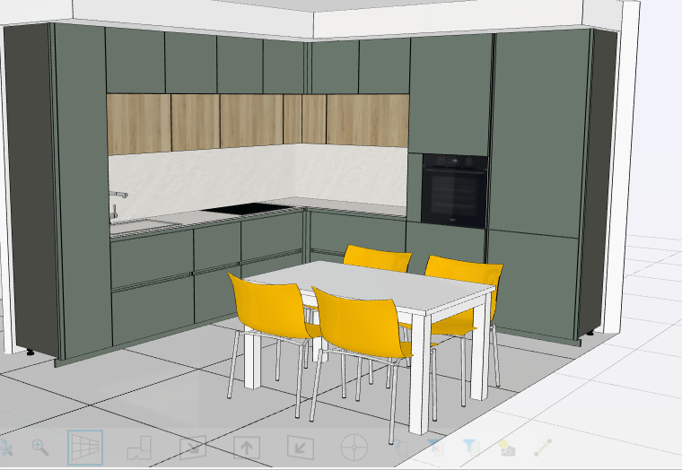 ultra photorealistic interior render based on the provided image preserve exactly the original kitchen layout cabinet proportions wall positions and camera perspective remove all technical labels and construction symbols do not modify cabinet colors wood tones countertop material backsplash color furniture proportions or layout color fidelity all materials must remain exactly the same color as the reference image no color reinterpretation or tone shift materials tall cabinets and base cabinets must appear in matte lacquer in the original green color with smooth soft light diffusion the upper wall panels must appear in natural light wood with realistic wood grain and subtle texture depth the countertop and backsplash must remain plain white with a clean smooth surface floor must remain the same tone with realistic reflections styling add minimal kitchen objects on the countertop such as wooden cutting board ceramic container small jars olive oil bottle objects must look natural and well spaced lighting soft natural daylight coming from the right side balanced global illumination soft shadows under cabinets and table no warm color cast no dramatic contrast rendering style high end architectural photography look photorealistic materials sharp textures neutral natural color grading original material colors must remain unchanged