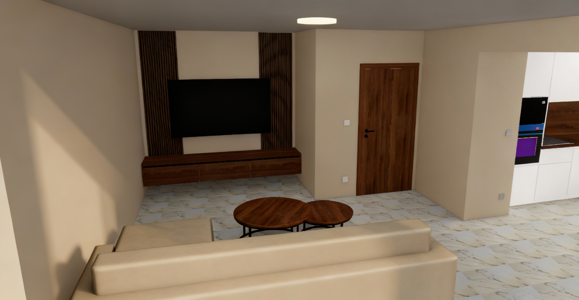 evening view during the winter time add a few maple and birch trees with no leaves colored on the left side of the view add wild prairie grass and 3 of snow to the landscape add tire tracks in the snow leading to the car port the house material is site cast concrete with a natural warm clay color add a land rover in the carport add a woman walking towards the front door add a man and a dog leaving the carport walking towards the front door the roof facia is dark gray metal flashing