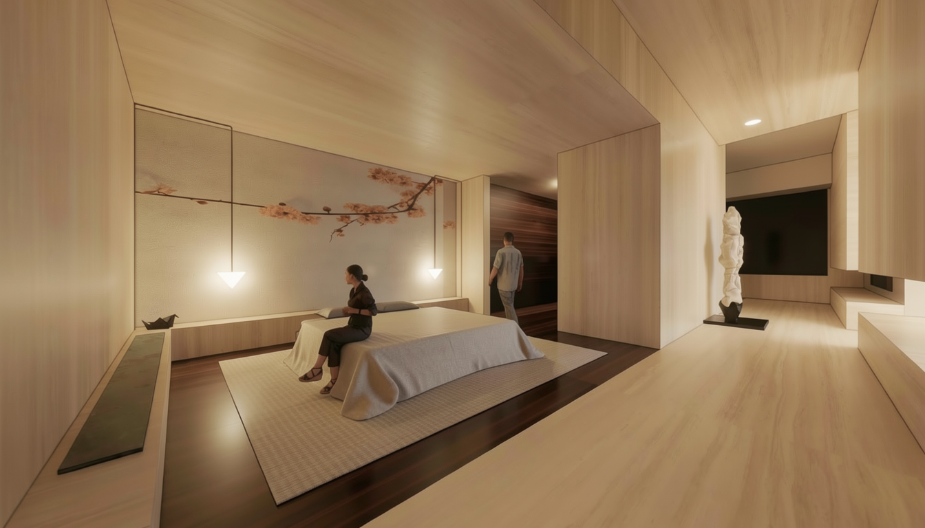 refine this interior bedroom rendering while preserving all geometry composition materials and objects exactly as they are do not redesign or add anything only adjust lighting and material softness lighting adjustment slightly warm the overall lighting tone soft golden warmth reduce any harsh or flat illumination create a softer more ambient and intimate atmosphere maintain the existing lighting placement and intent just refine quality and diffusion bedding material refinement make the bedding appear softer and more tactile enhance subtle fabric softness and light absorption maintain the exact same material texture and pattern preserve the visual blending between the bedding and rug do not separate or increase contrast between them material response to light slightly soften how light interacts with all materials reduce any overly sharp highlights keep wood and wall tones consistent just warmer and more cohesive color atmosphere keep palette neutral and calm slightly warm overall tones without increasing saturation maintain a quiet minimal and serene atmosphere important constraints do not change furniture layout or architecture do not add decor lighting fixtures or objects do not alter material types or colors do not increase contrast between bedding and rug optional line use this it helps guide subtlety emphasize softness warmth and quiet minimalism while maintaining a seamless material continuity travertine material refinement adjust the travertine surfaces walls floor and ceiling to appear more natural and slightly rougher reduce smoothness and any reflective or polished appearance introduce subtle surface variation and porosity typical of honed or lightly textured travertine maintain the same color and tone but improve realism through micro texture and light absorption avoid making the surface overly rough or noisy keep it refined and high end