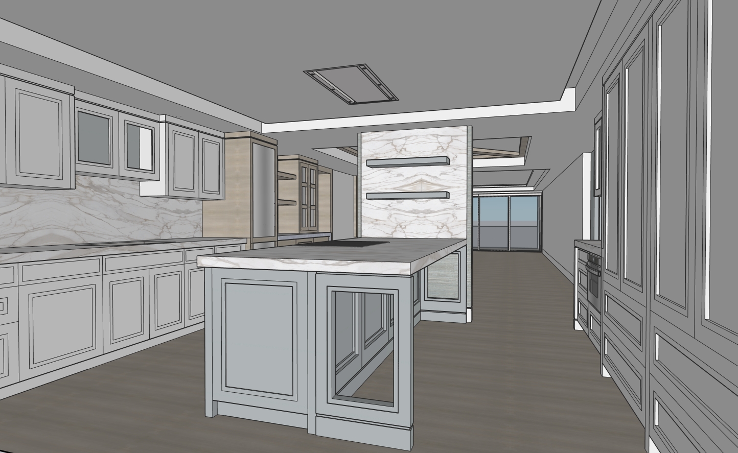 transform the provided elevation into a hyper realistic interior photograph that is indistinguishable from a real professionally shot interior design photograph this must read as a real space captured by a camera not a rendering not a visualization not architectural cg not concept art and not an illustration geometry lock non negotiable preserve the exact original geometry layout proportions ceiling details wall depths panel divisions openings doors cabinetry locations millwork dimensions built ins and circulation paths with zero architectural changes nothing may move scale simplify or be reinterpreted geometry must remain absolutely unchanged camera derivation critical derive the camera position height angle and framing strictly from the uploaded elevation eye level interior photography centered or naturally balanced composition 24 35mm interior lens feel no dramatic angles no stylized framing do not reuse or approximate camera framing from any previous image remove all drawing artifacts completely remove all linework cad edges drafting outlines diagrammatic shapes sketch artifacts nothing may appear outlined flat schematic or illustrative the elevation must be visually reinterpreted as a finished real interior photograph material realism rules wood if present smooth solid plank material extremely subtle restrained grain matte or soft satin finish only no graphic patterns no decorative striping no visual noise wood must absorb light gently never glossy or sharp fabric upholstery if present soft compression subtle seams gentle shadowing natural fabric texture no flat color blocks stone slabs if present light natural veining soft organic variation low contrast no symmetry no bold or busy patterns stone must feel heavy and grounded walls fine surface texture slight tonal variation never flat paint edge construction realism all edges corners joints and transitions must be softly broken and physically realistic no razor sharp corners no cgi perfect edges slight construction tolerances only everything must read as fabricated installed and dimensional lighting photographic behavior lighting must behave like real high end interior photography natural daylight only unless otherwise specified realistic light bounce gentle shadow falloff uneven exposure distribution subtle brightness variation across surfaces avoid studio lighting uniform illumination over clean exposure global illumination look slight softness is preferred over sharpness camera image imperfections very important introduce subtle photographic characteristics gentle lens softness micro exposure variation natural contrast roll off mild atmospheric depth primary plane sharp background slightly softer the image must feel captured not generated absolute constraints no creative interpretation no stylization no exaggeration no added or removed elements any deviation from the original elevation geometry or intent is unacceptable negative prompt always include architectural rendering 3d visualization cgi unreal engine octane vray sketchup look flat textures graphic lines outlined edges over sharpened studio lighting concept art illustration ai look plastic materials glossy wood high contrast grain perfect symmetry keep design as shown in the picture keep the design as it is in image light cabinets are white and brown cabinets are white oak keep design in the image as it is including materials keep the materials as in image