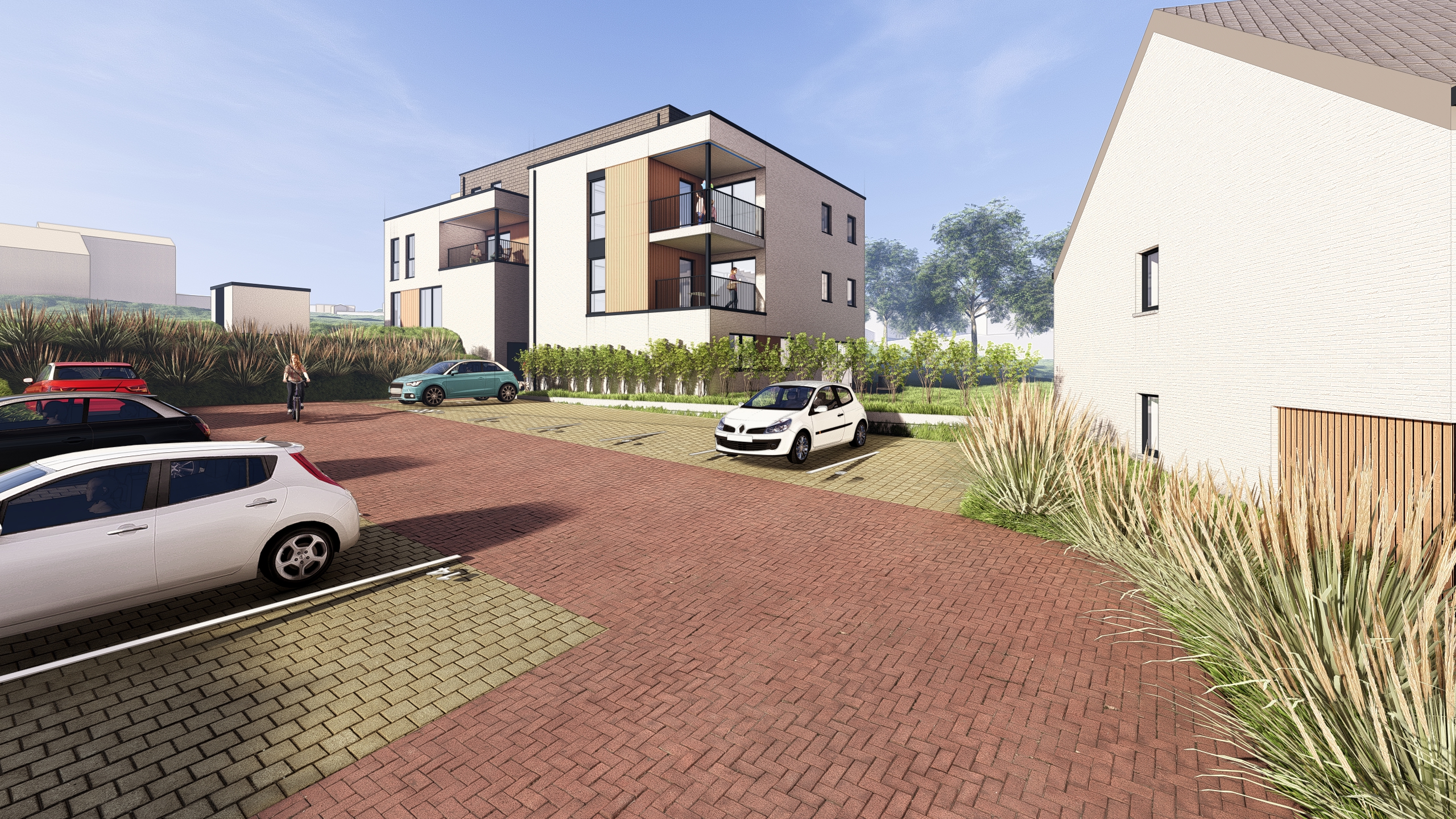 render a photorealistic 3d perspective with lot of light some tree on the background