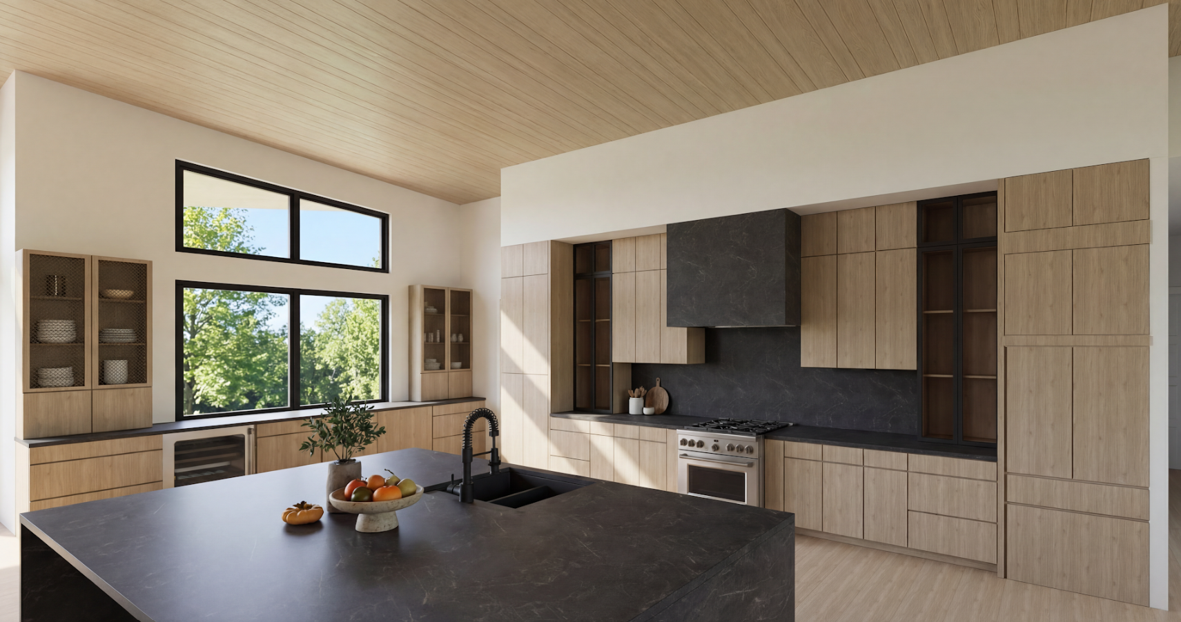 use this exact rendered image as the base every single element is preserved exactly as shown the oak cabinetry dark honed stone countertops and backsplash hood range wine fridge sink black faucet ceiling planks flooring fruit bowl plant natural daylight trees blue sky through the windows shadows on the floor and island all unchanged do not alter any of these the only changes are the two listed below change 1 left wall cabinets remove mesh add clear glass the tall cabinet on the far left wall currently has a wire mesh insert replace the door insert with clear flat glass fully transparent with a subtle natural daylight glare and faint reflection visible on the glass surface not frosted not tinted not mesh not wire just clean clear glass in the same oak frame the interior contents plates ceramic objects dishes remain visible and styled exactly as currently shown through the glass oak frame proportions and cabinet body stay exactly as shown no knobs no pulls no hardware of any kind change 2 right wall cabinets black framed glass with sheen and interior styling the open shelf style cabinets flanking the hood on the right wall must be updated to have black metal framed glass doors the black metal frames carry a subtle satin sheen not matte flat black not mirror chrome but a quiet metallic depth that catches daylight naturally the glass inserts are clear with a visible glare the interior of these cabinets must be styled with tall clear long stemmed wine glasses grouped in pairs on the upper shelves neatly stacked white or matte ceramic plates on the lower shelves and one small minimal ceramic object all objects sit naturally on the shelves cleanly visible through the glass no knobs no pulls no hardware on these doors no hardware anywhere in the image no knobs no pulls no hinges visible on any cabinet all doors are push to open completely clean flat faces do not add any furniture fixtures pendant lighting decor plants or architectural elements beyond what is already in the image and described above
