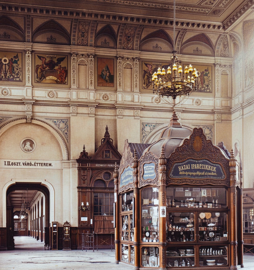 people in 1900 s styl fashion walking lit chandelier bulbs and wall sconces giving interior light night illuminated hall cinematic view