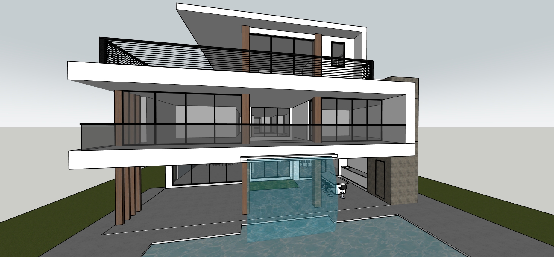 modern minimalist house with a sleek design featuring white and gray exterior walls the balcony railings are black providing a striking contrast large glass windows reflect a tranquil clear blue sky emphasize a transparent blue swimming pool with gentle ripples creating a serene atmosphere add accents of natural wood around the columns and doors surround the house with vivid green grass enhancing the peaceful upscale ambiance