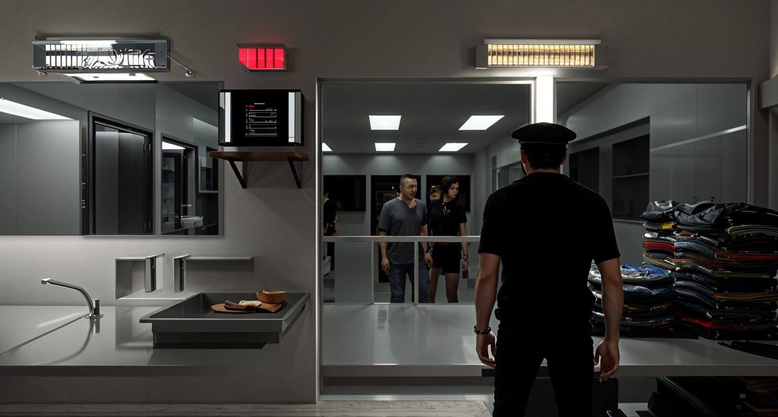 render a modern interior living space bathed in natural daylight use a warm inviting atmosphere with the following color palette walls in a soft off white tone dark wood accent wall with textured wood panels light grey fabric sofa facing outward minimalistic shelves in light grey wooden window blinds in a warm oak shade allowing soft light in hardwood floors in a natural light brown finish white desk and cabinetry with clean lines include subtle reflections and soft shadows to create depth and realism strive for a harmonious cozy yet modern aesthetic