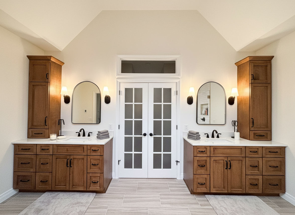 convert to a more modern farmhouse aesthetic with modern style large gabled dormer over the garage and left side roof new dormer roofs to have metal standing seam roof in a bronze color darken remainder roofing to dark brown add a new tall entry feature with covered gabled entry and rustic wood columns