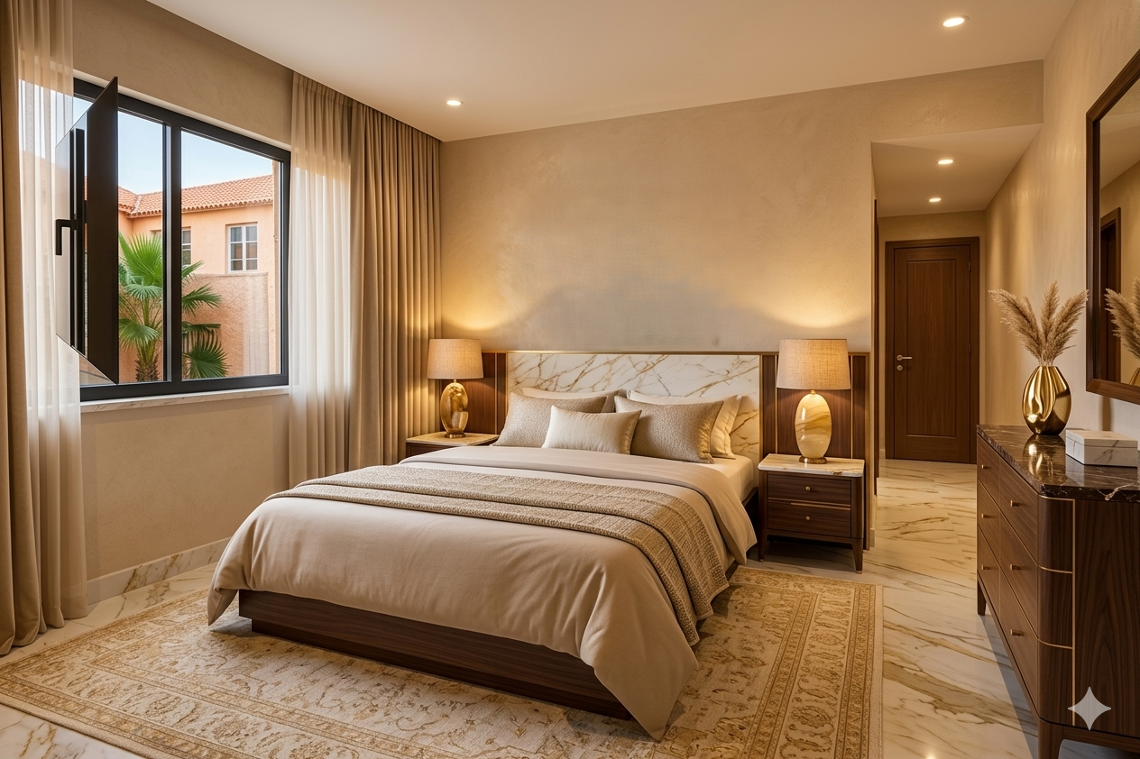 inserisci materiali come marmo e legno scuro in una parete decorativa dietro la testiera del letto