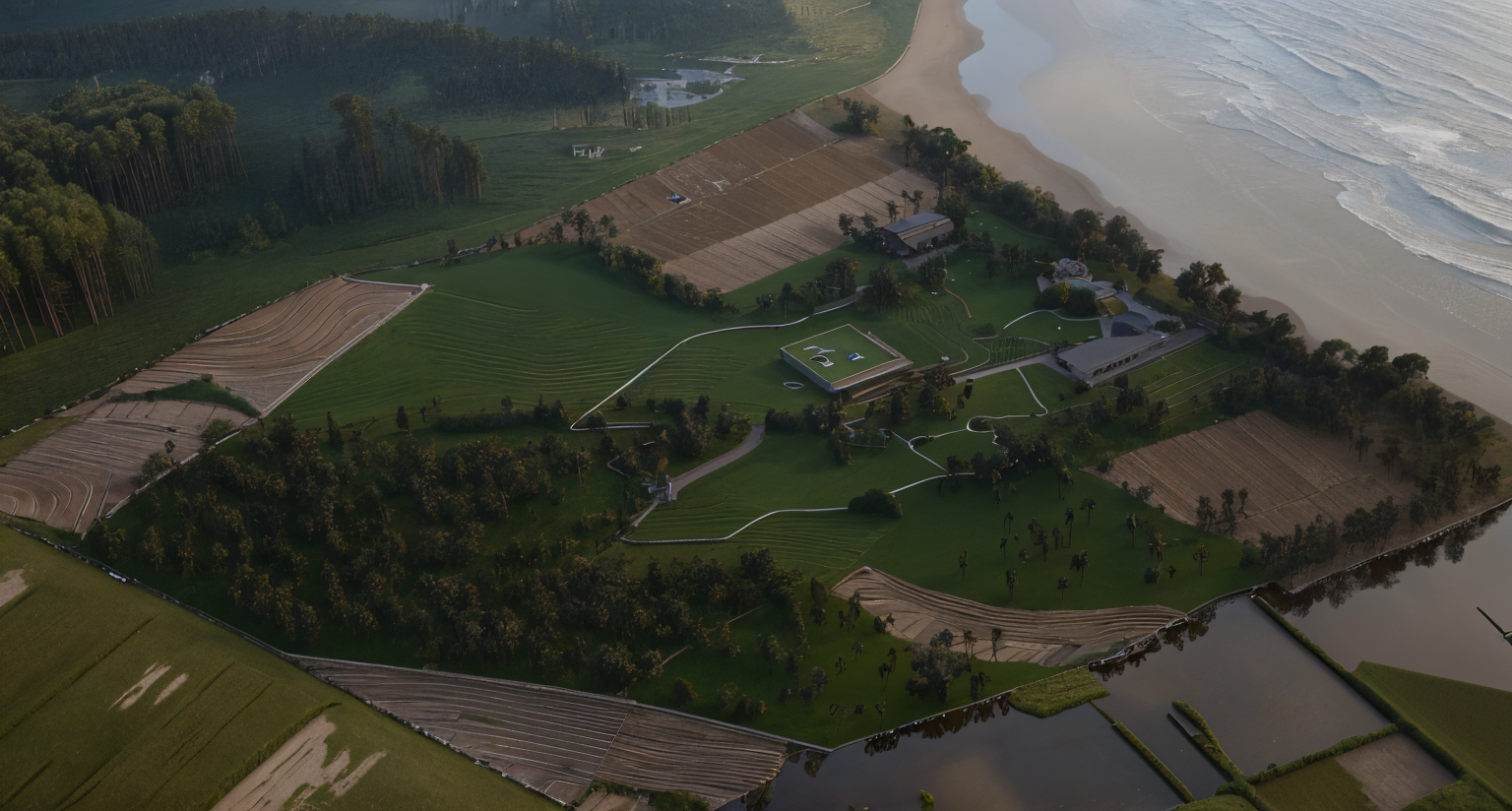 blend the overall tone of the existing render drawing for a more cohesive and natural look while enhancing material details lighting and textures for realism refine surfaces vegetation and shadows with subtle depth and clarity keep the angle and composition exactly the same without altering the original design or layout